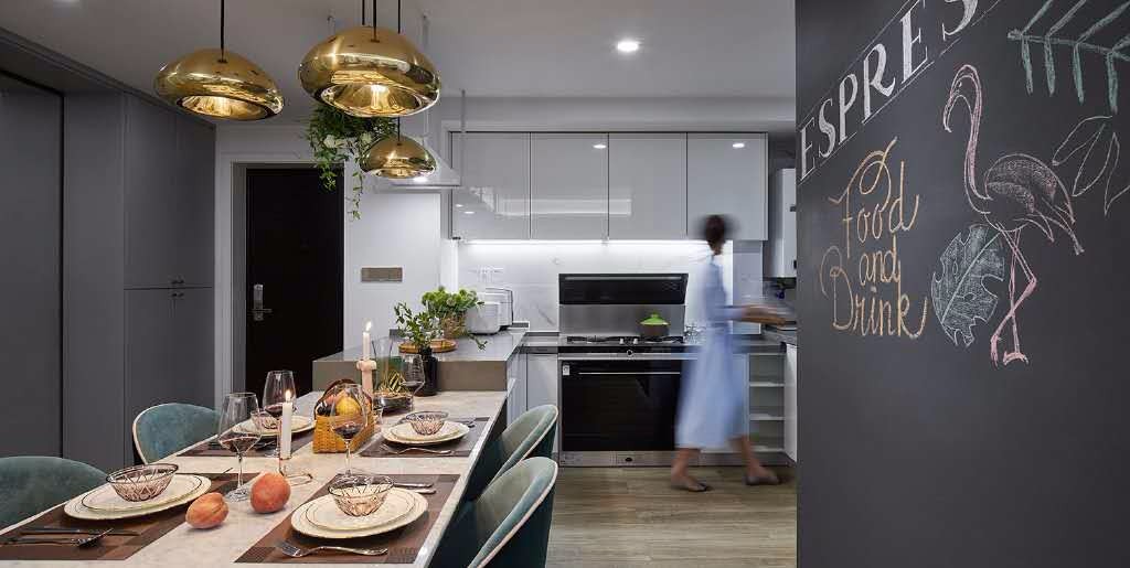 温雅的厨房设计,颜色冲撞的黑色黑板墙,既温馨了主人的内心,又在无形当中为生活增添了一丝丝的情调