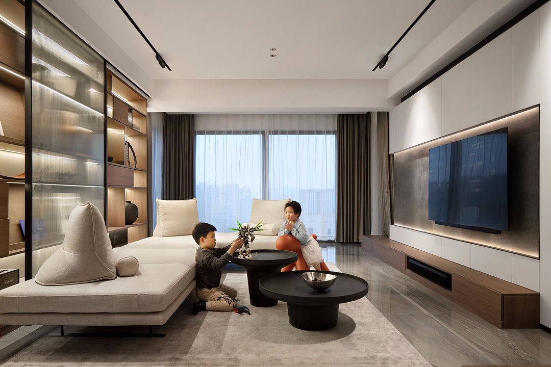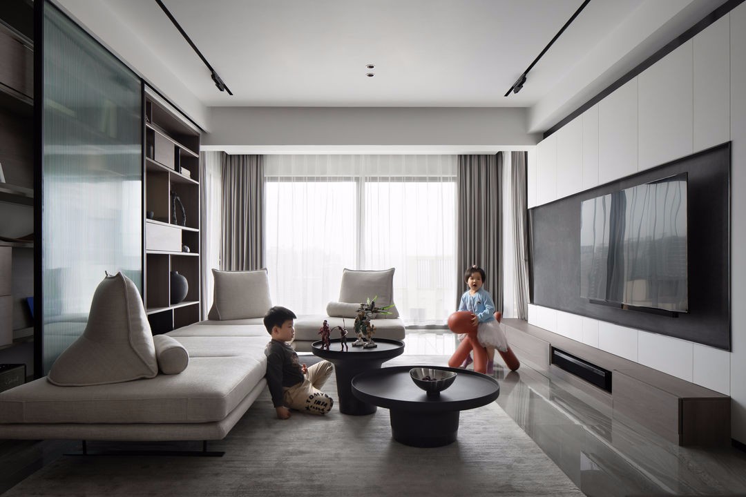 希望用一个推拉移门的动作,呈现开合、收放的变化,成为屋主展示小朋友的手工画作与收藏爱好的文化墙,取代传统沙发背景墙带来的刻板印象