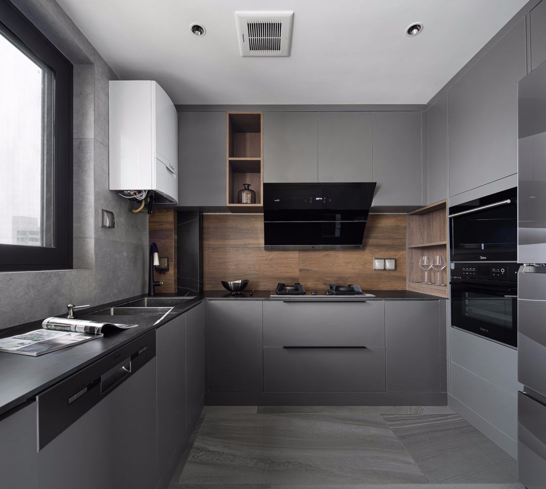 厨房的色调也是很喜欢的部分,大面积的灰色质感表现突出,木色墙面解放了空间的单调,选择深色的岩板台面也是我和屋主一直很喜欢的部分。