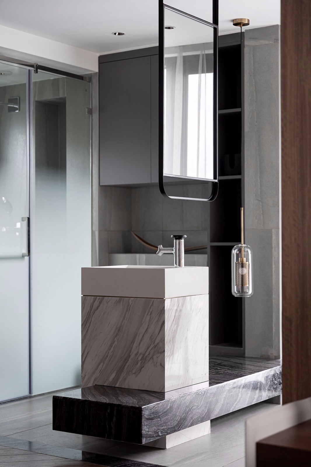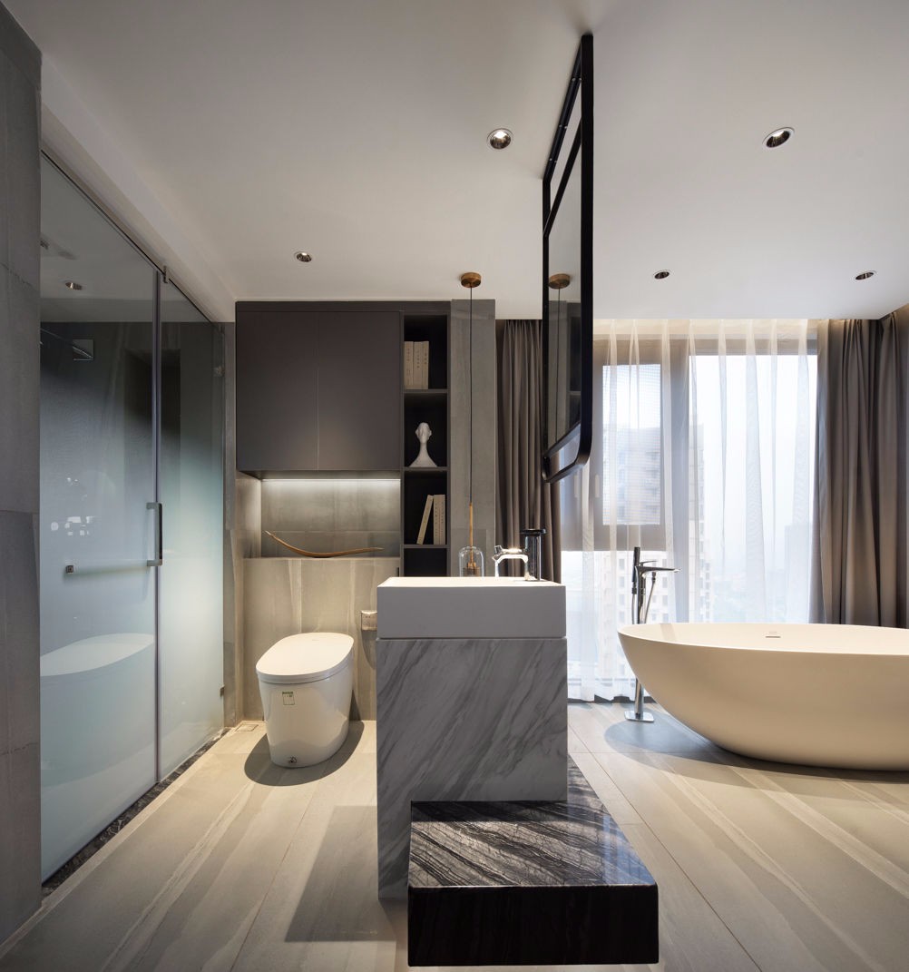 淋浴房玻璃是采用的渐变材质,这样淋浴空间既不会像磨砂玻璃不通透的感受,也让私密与暧昧之间微妙的空间氛围弥散其中