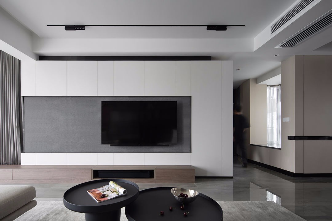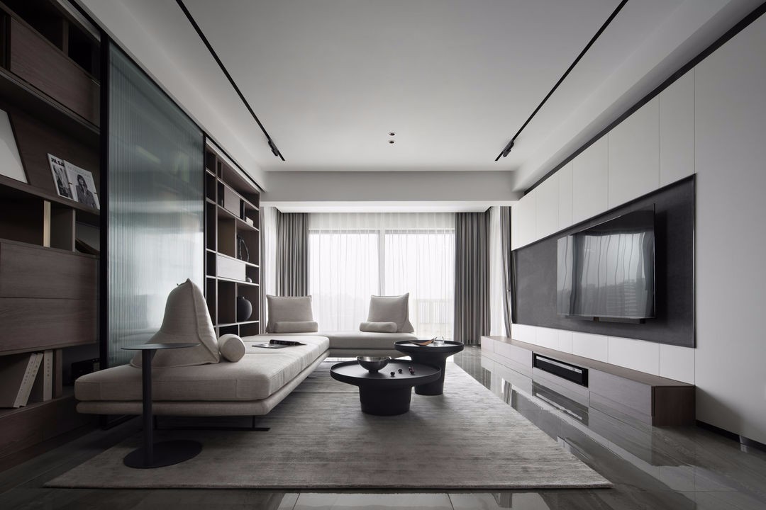 把焦点留在沙发背景的整面开放书柜,但并不打算将柜体封闭起来,配合横跨整个沙发柜体的移门