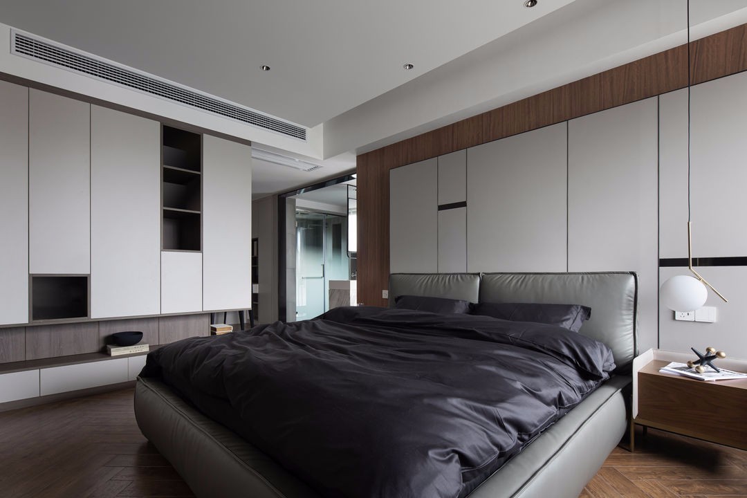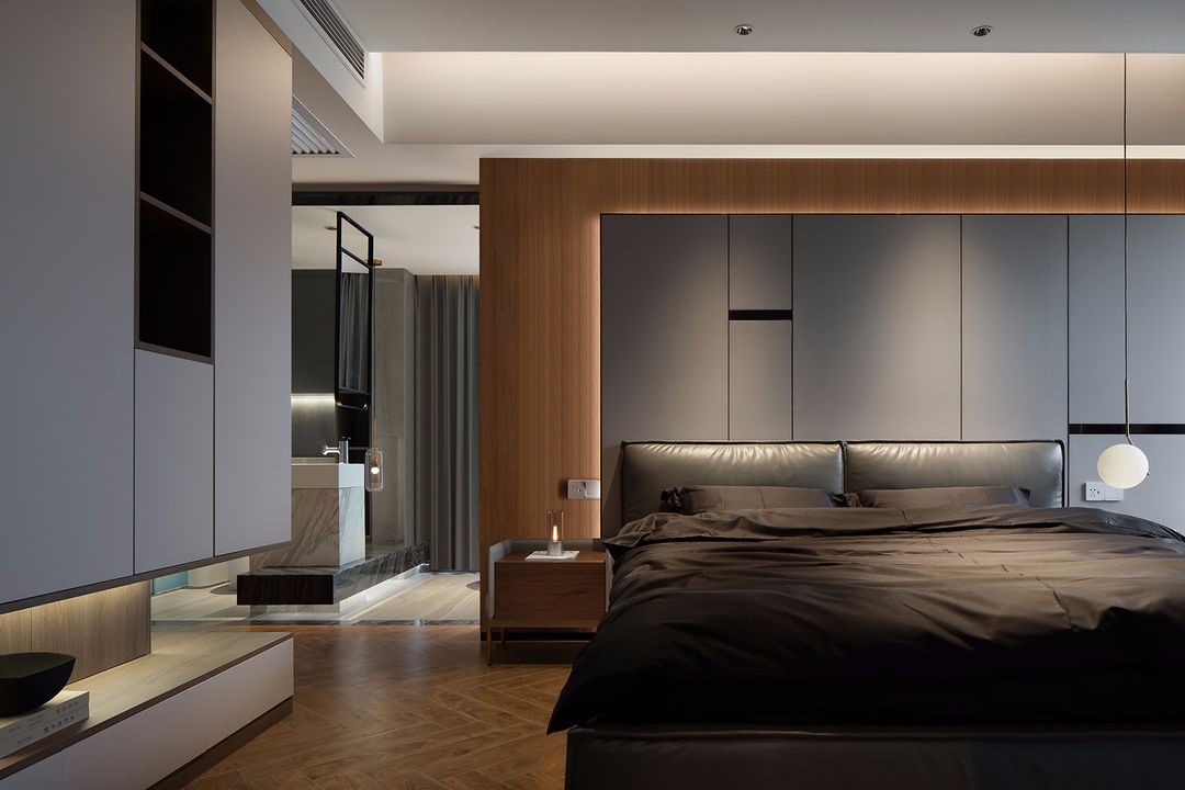 卧室整体维持比较简单干净,床是家具厂定制的颜色,床头柜特意选择了与床头背景呼应的皮质与木结合的元素。