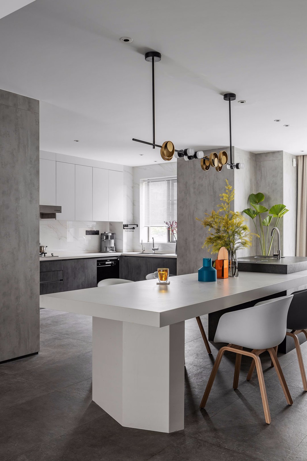厨房的设计考虑如何一个可以展现厨艺的舞台,而不是把厨房进行封闭式,自个去做饭,烹饪和做饭是两个概念,家应该是自我展示的舞台,需要给朋友一起去分享制作美食的过程,而不是一个封闭的厨房默默的去做饭,运用开放式厨房让家是一个有情感的一个交流空间,和朋友的一个互动的空间。