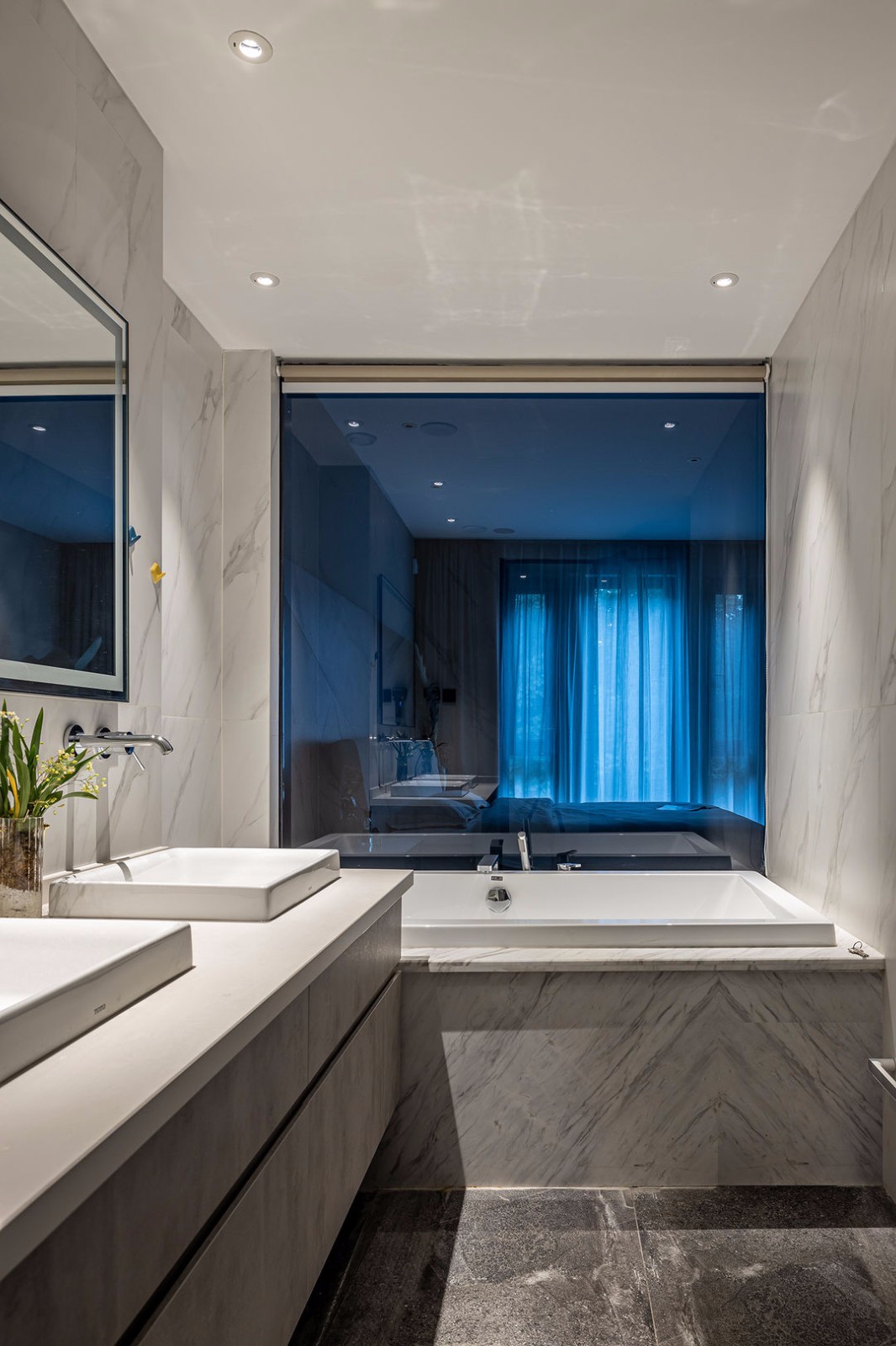卫生间也不例外,以暖灰和白色为主,年轻的主人在劳累的一天工作后,可以快速的回归到温馨的家里