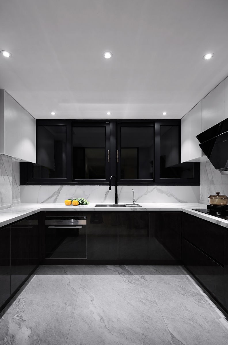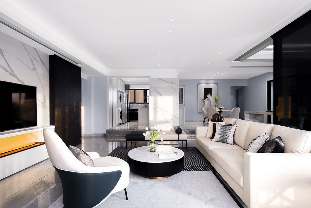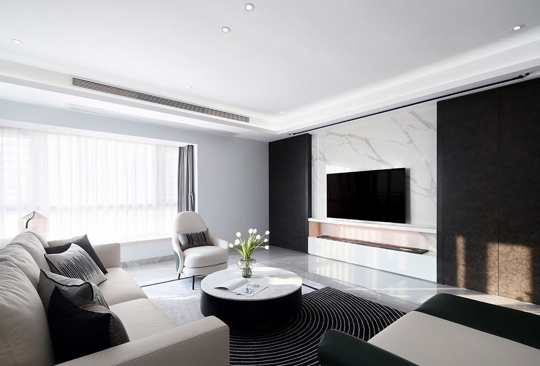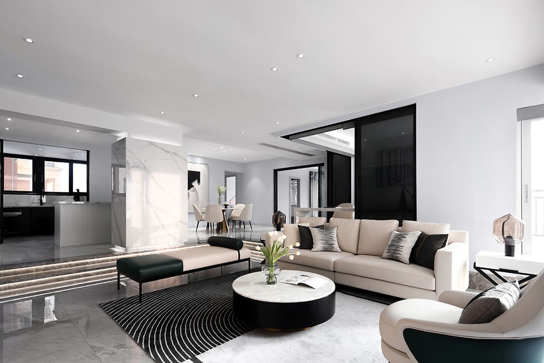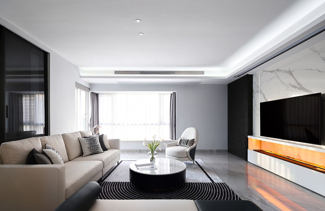 客厅黑白空间,少了花俏色彩的点缀,剩下空间与空间、面与线的对话,颜色的变化也只是在白到黑的色度变化。