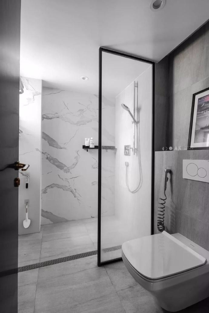 卫生间同样采用黑白灰的装饰效果,半掩饰的钢化玻璃防止水溅出到马桶上,方便打扫清理