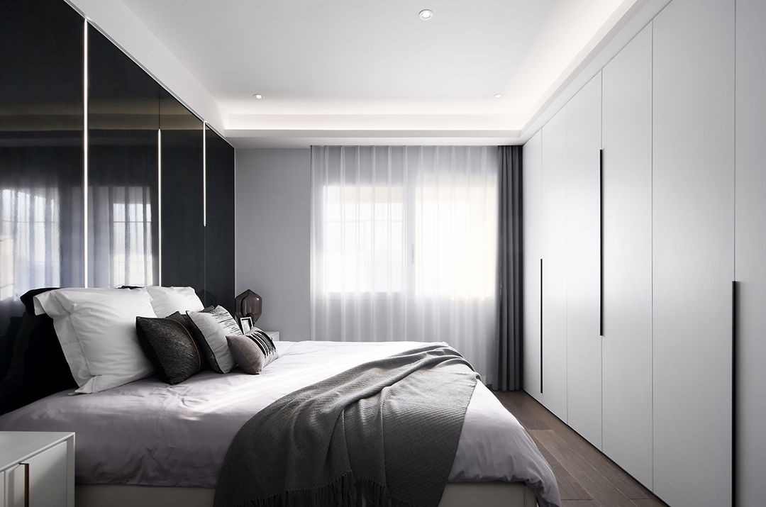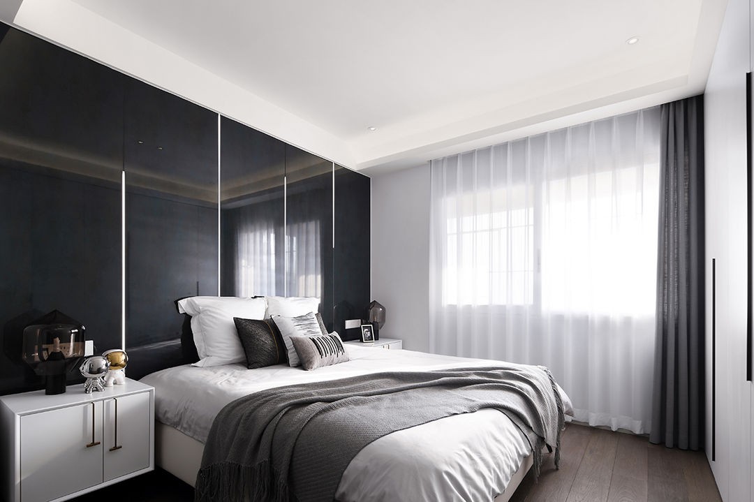 主卧承袭了整个空间的黑白基调,并融入了黑白交融的产物——灰色。灰色缓和了黑白带给人的生硬冷寂之感,给空间带来更加轻盈的韵律,形成特定的气质内涵。空间的对称会使气氛变得更加沉稳,尤其在卧室里。