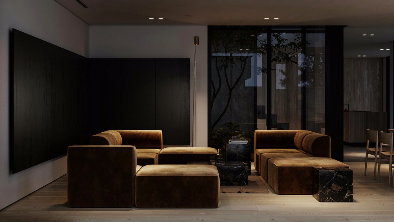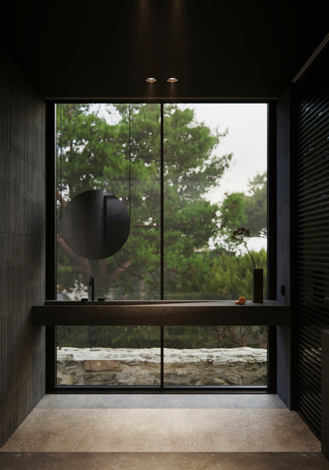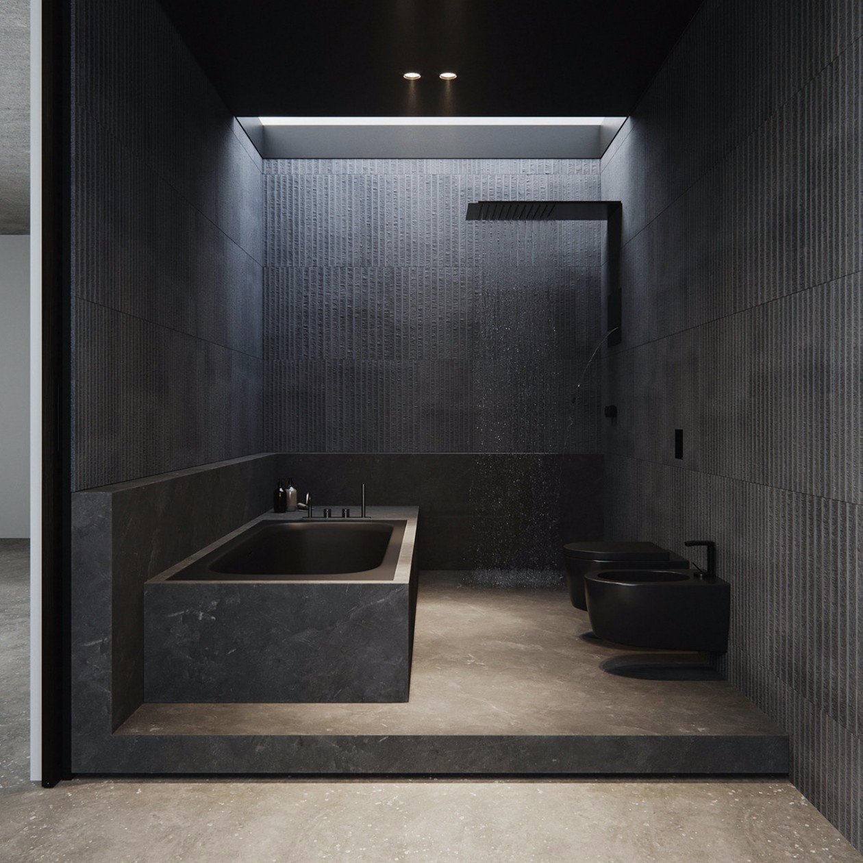 卫生间使用全色灰黑色,并且采用无主灯设计