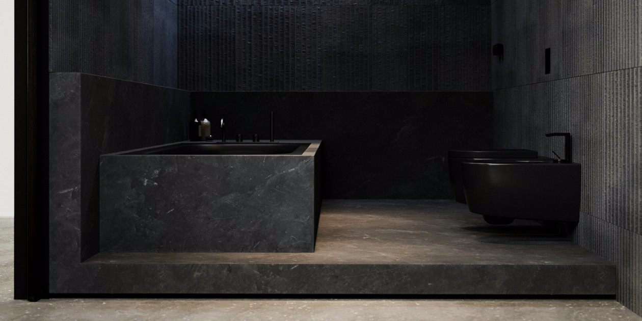 灰色系大理石搭配纯黑色浴缸和马桶,加上射灯的氛围增加,舒缓一天的劳累