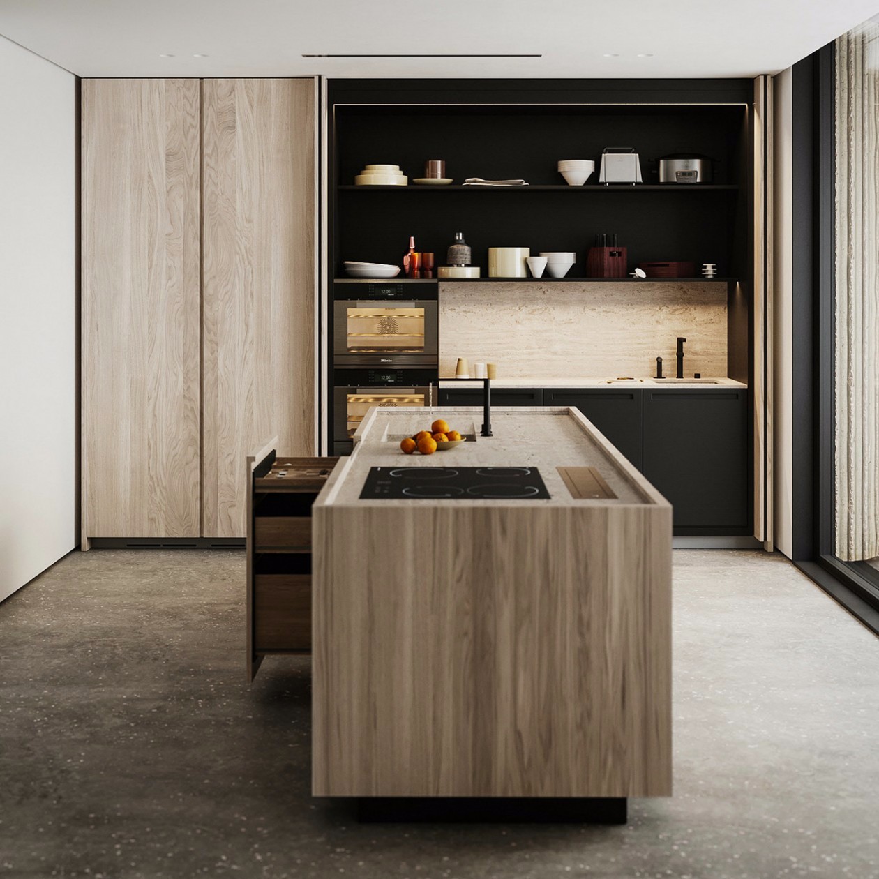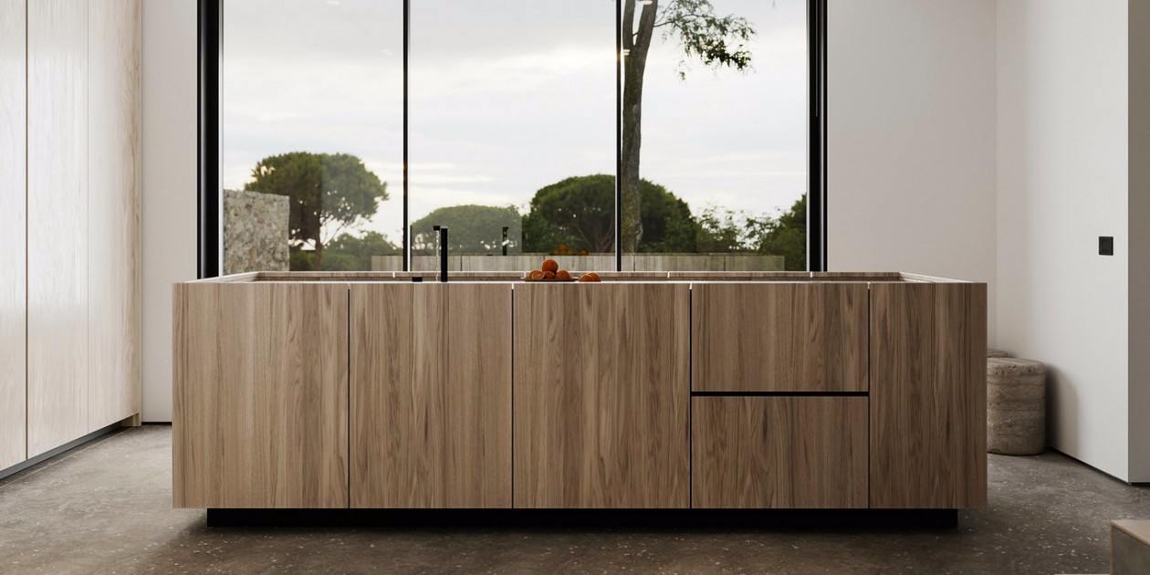 厨房在一楼,采用原木系列的岛台使用。做饭之余可以直接通过窗户看到外侧的景色