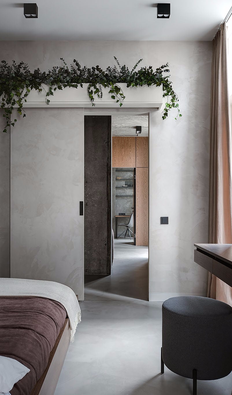 卧室门使用工业风的谷仓门,打破了原始平开门的规则