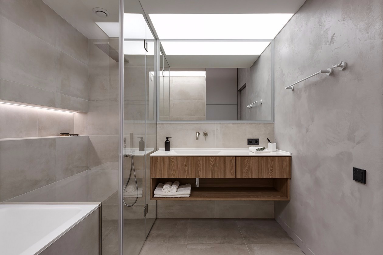 卫生间淋浴房正常贴砖,而外侧的墙面并没有贴砖装饰,而是直接打磨墙面做地坪漆处理