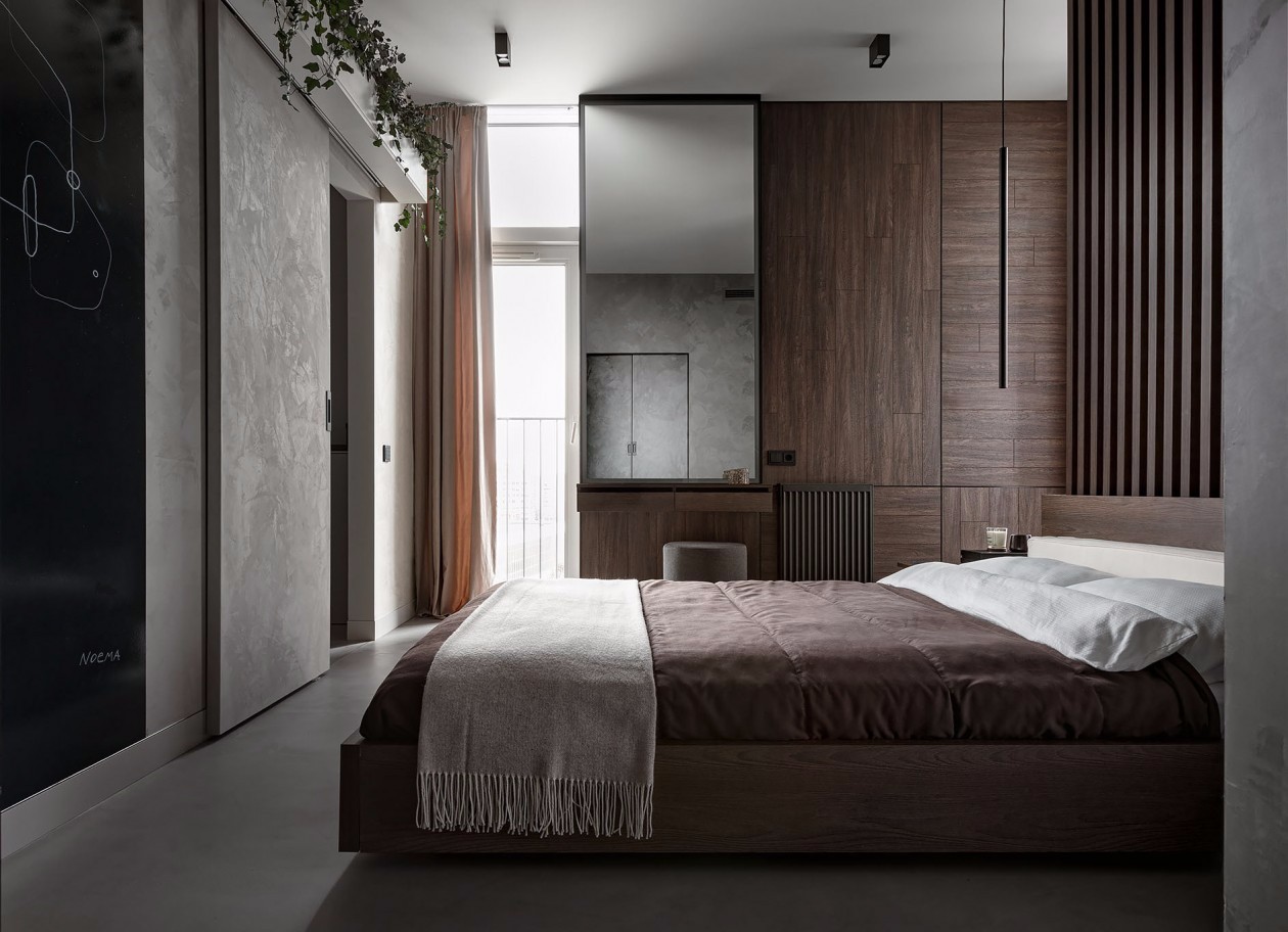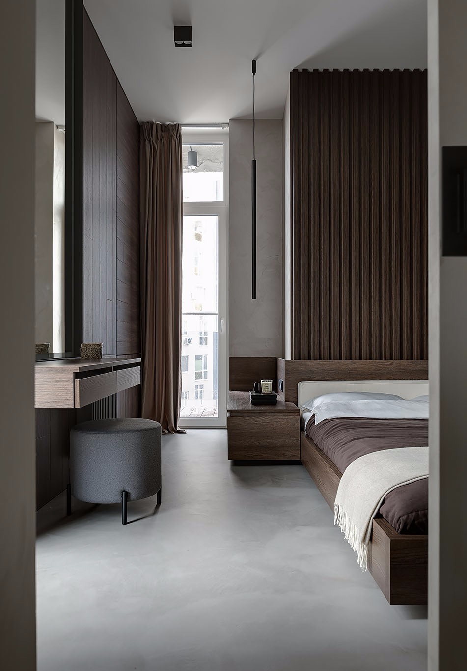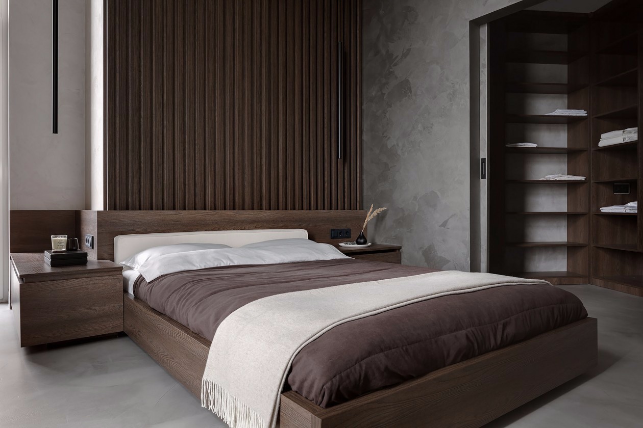 卧室的棕色咖色系木格栅,和床头柜衣帽间的颜色互相衬托