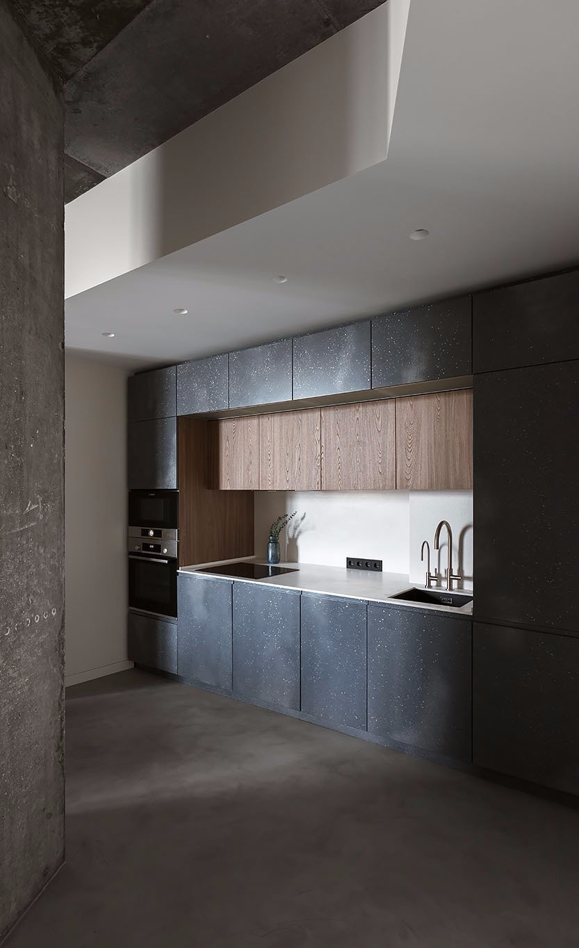厨房在房子的一侧,位置不明显,整体使用黑色系搭配原木系列,简约工业风
