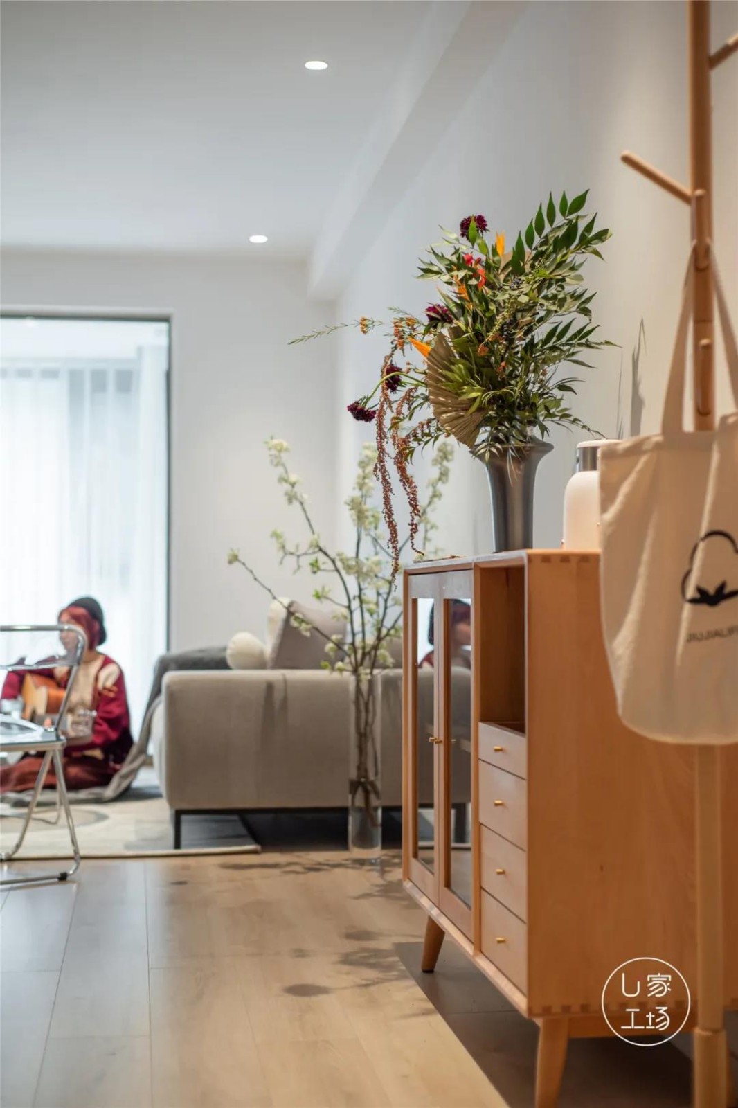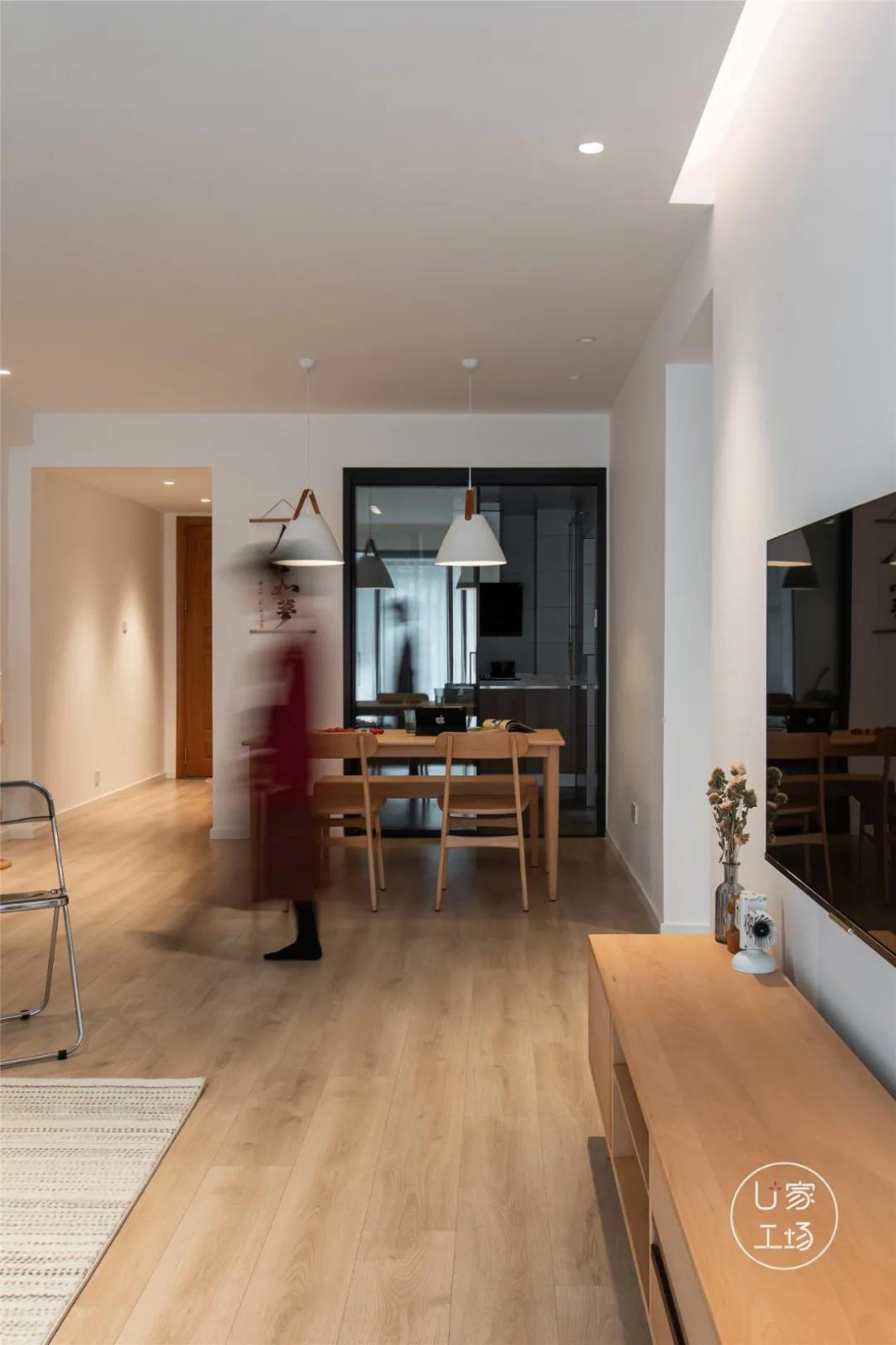 全屋贯穿白色+原木色+浅灰色的配色方案,墙面重新喷涂白色乳胶漆,更换深色地板为暖色系原木色地板。