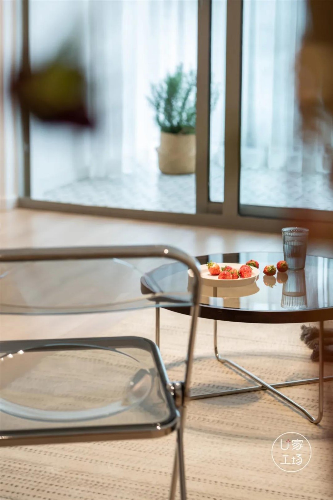 除此之外,客厅中再无其他功能性家具,偶有待客需求,一只随手可折叠收纳的单人椅既能满足落座需求,也能融入整体风格。
