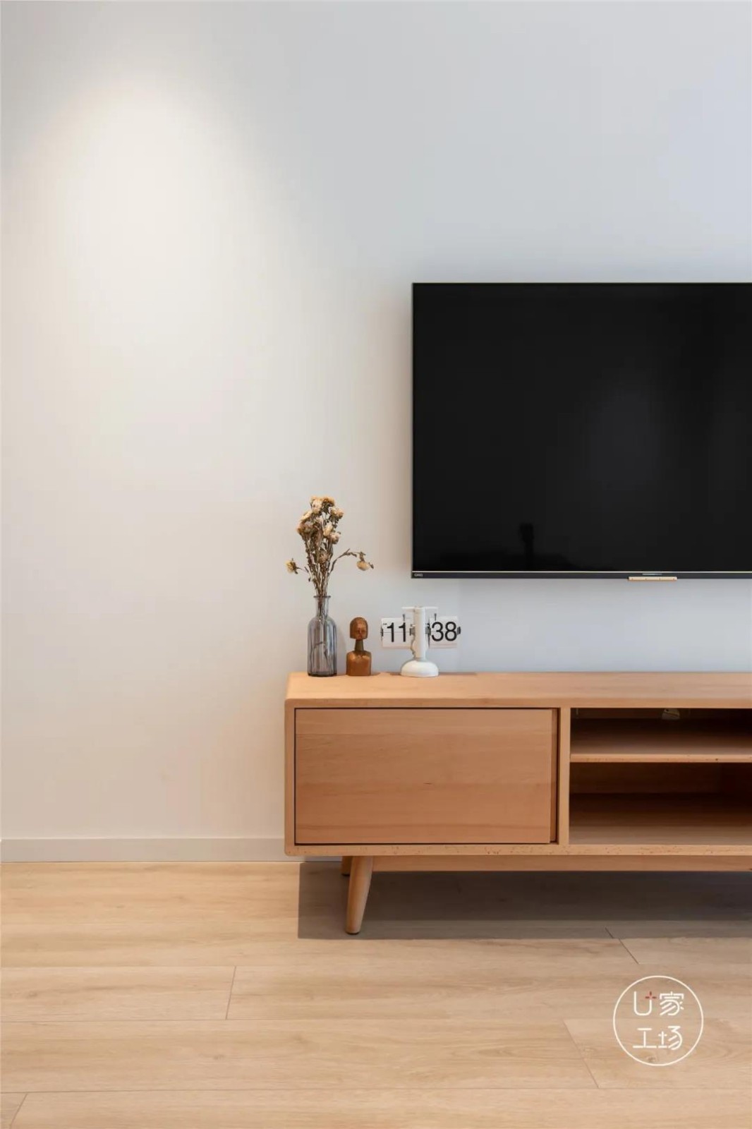 电视柜选择了榉木材质的,相对于樱桃木、橡木等木材,表面纹理更浅,基本只显现木头温润的本色,与极简风格相得益彰。