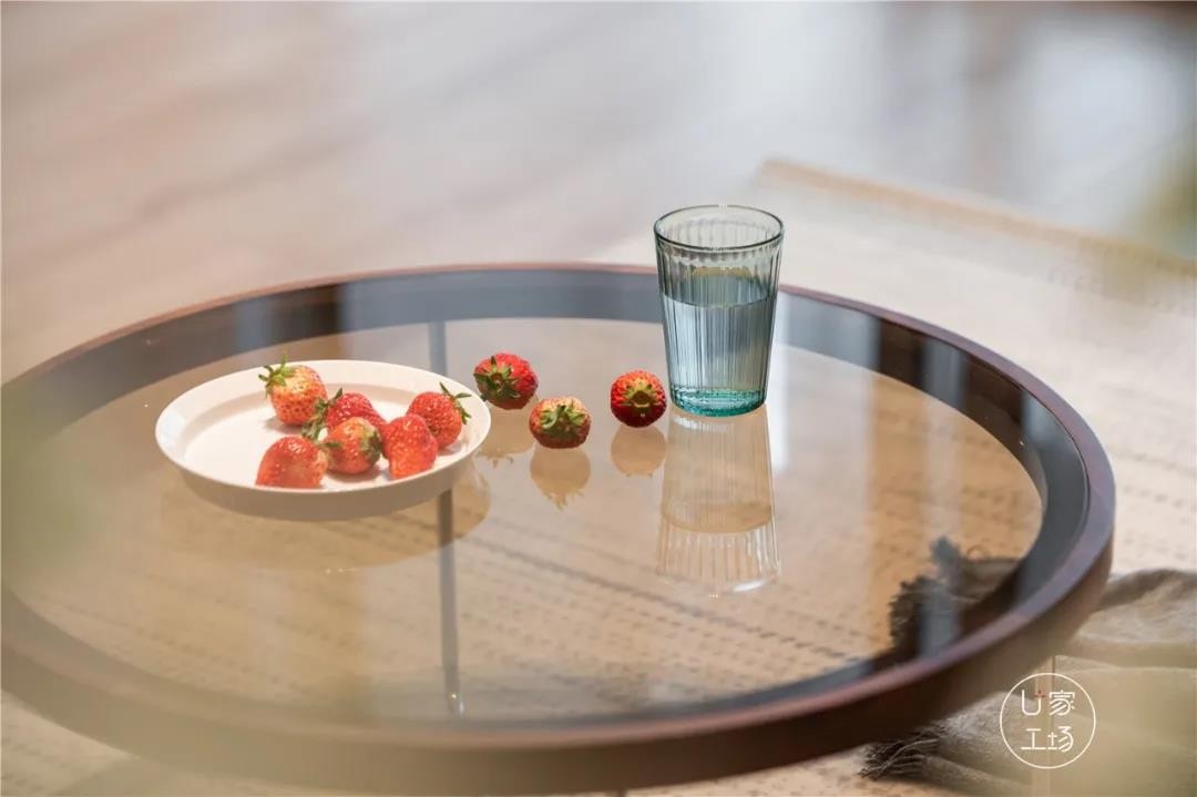 客厅中的圆形玻璃茶几造型格外精巧,细腿演绎极简,透明感营造格调。摆一碗当季水果,配一本心爱的读物,就能开启一段不被打扰的下午茶时光。