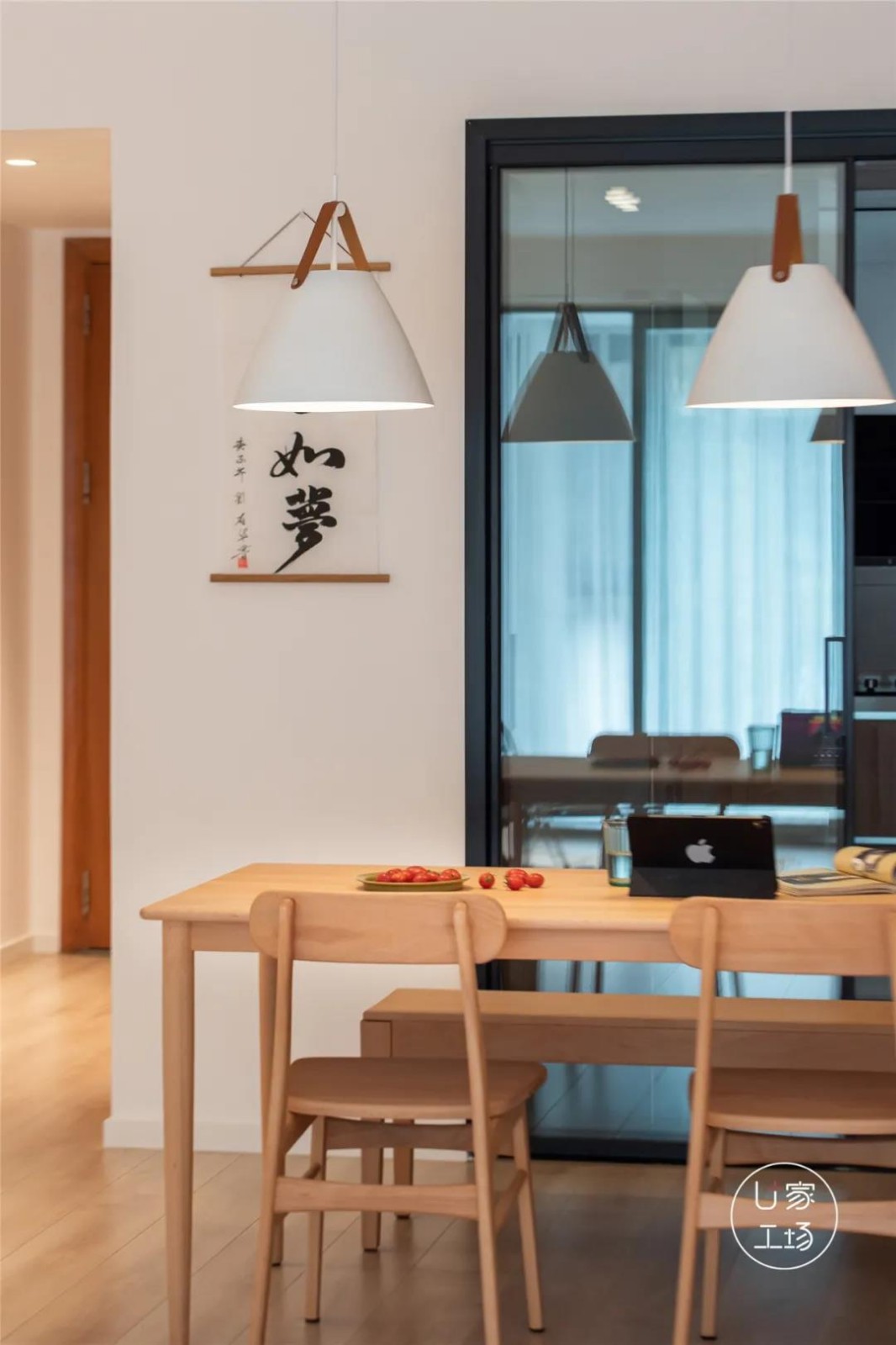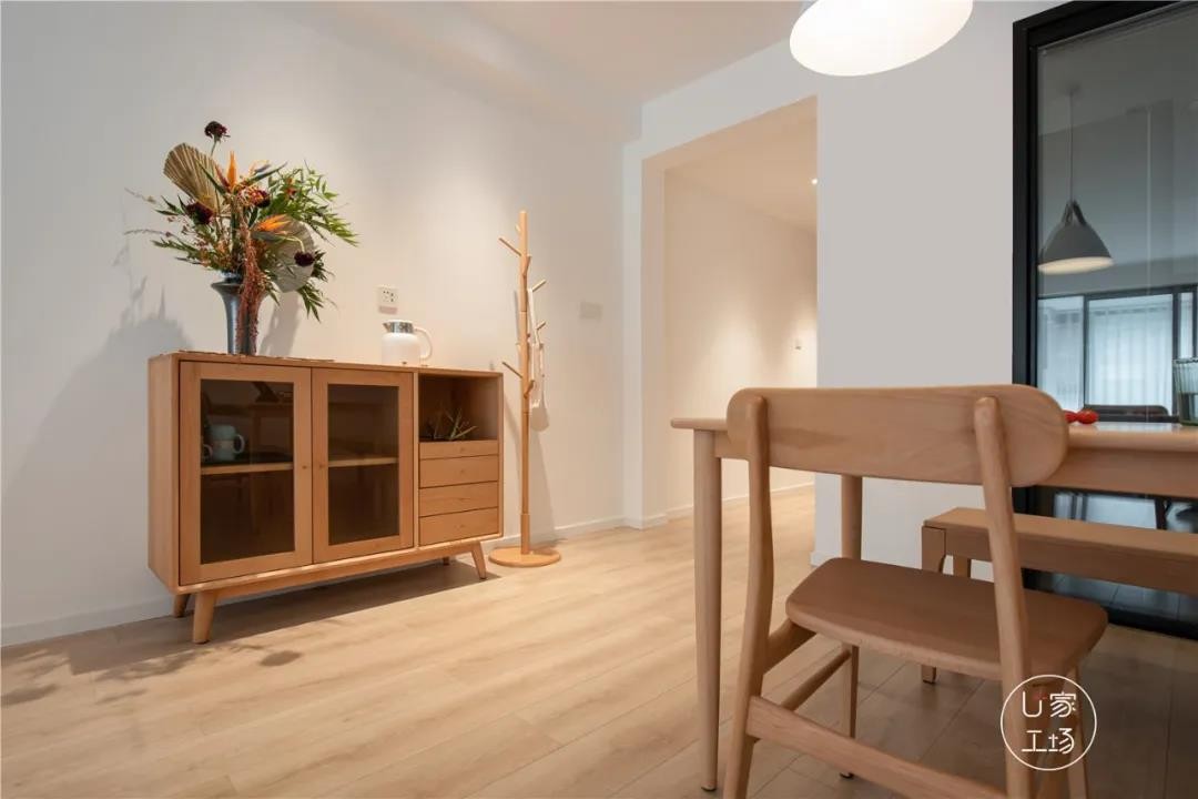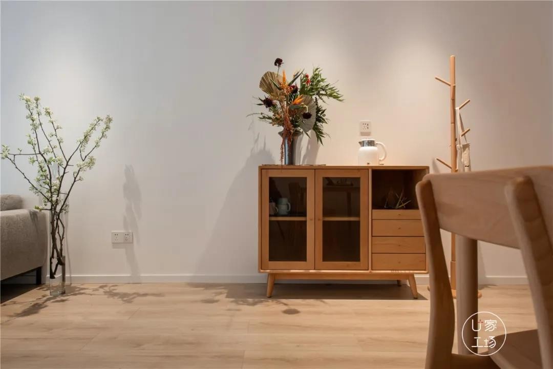 餐厅与客厅相连,以一个原木色餐边柜相隔,整体风格与客厅保持一致。原木色四人餐桌除了用餐之外,也会被当成办公桌来使用。餐桌椅特地选了细腿设计的,更具轻盈感。
