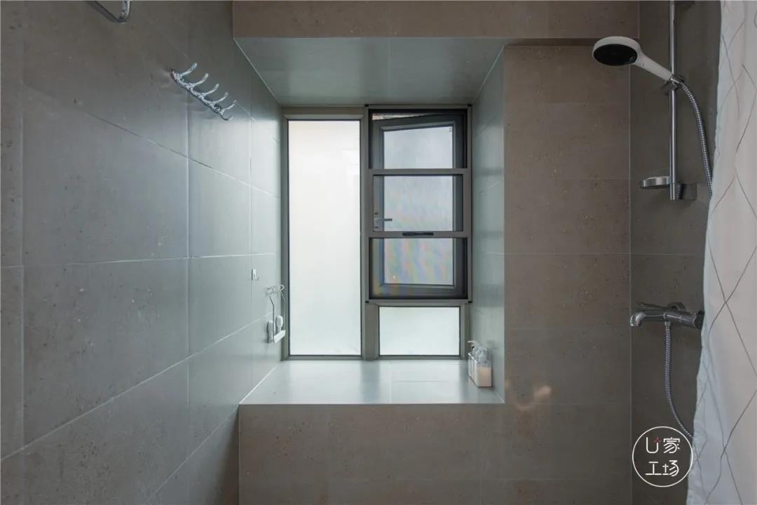 拆掉了容易藏污纳垢的玻璃门隔断,以浴帘代替,隔离洗浴区,平时不用的时候拉开,让自然光线透过卫生间的窗户流入室内,也更有利于通风换气。 洗浴区原有的露台无法打掉,干脆保留,作为洗发水、沐浴露等淋浴必备品的储物区,淋浴时随手可拿取,相当方便。