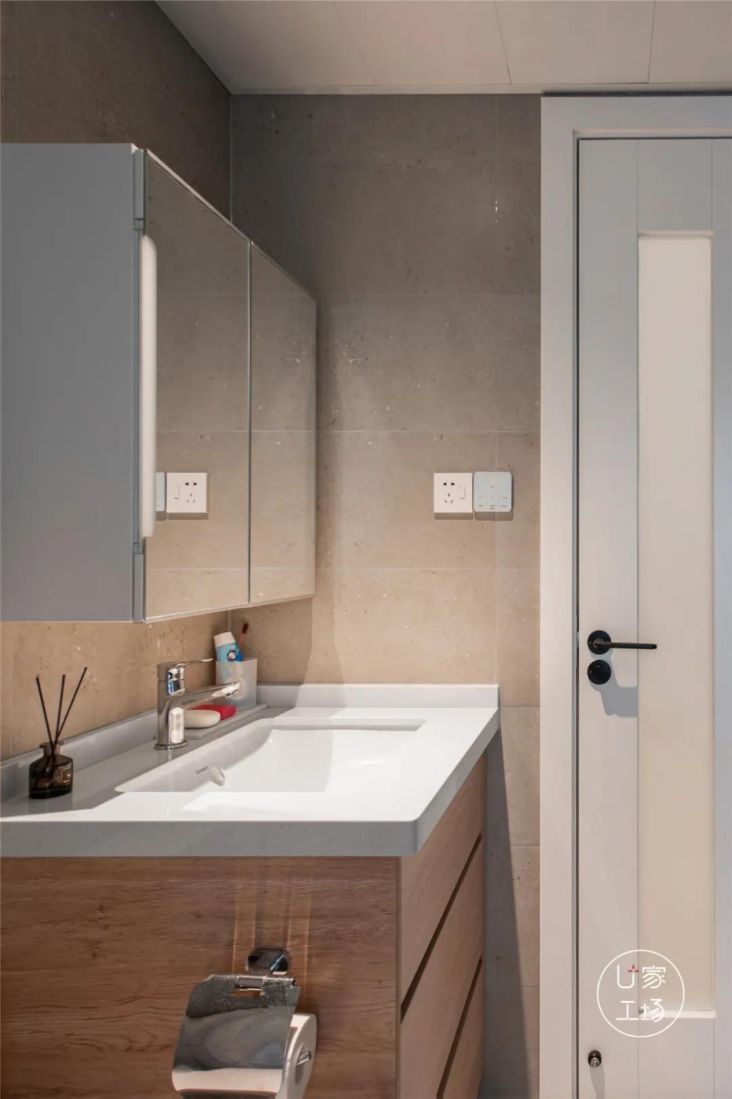 盥洗池下方换成了原木色橱柜,与全屋色调保持统一。墙面贴白砖,上方吊柜的门同样选择了白色,同色系搭配从视觉上“抬高”层高,避免小空间内的压抑感。