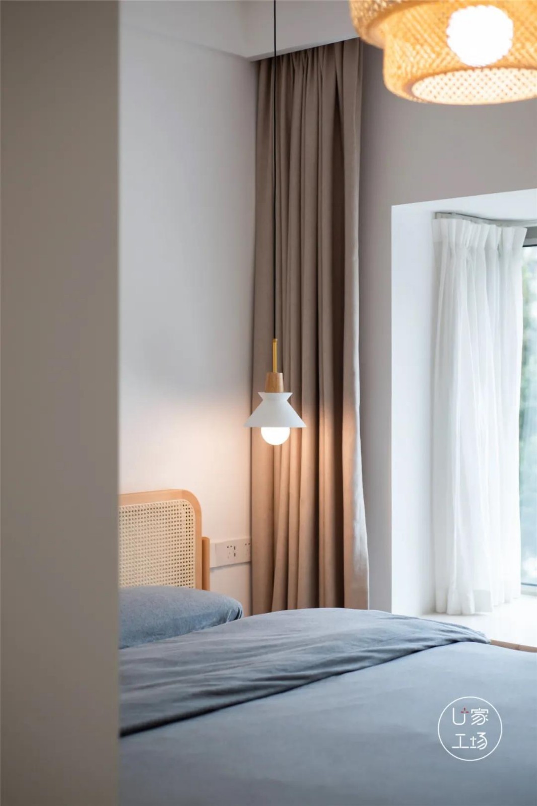 光源做了精心布置,主卧一共有三个光源,顶部吊顶作为主光源,竹编灯罩利用光线制造阴翳之美,暗室微光,令人舒缓而平静。