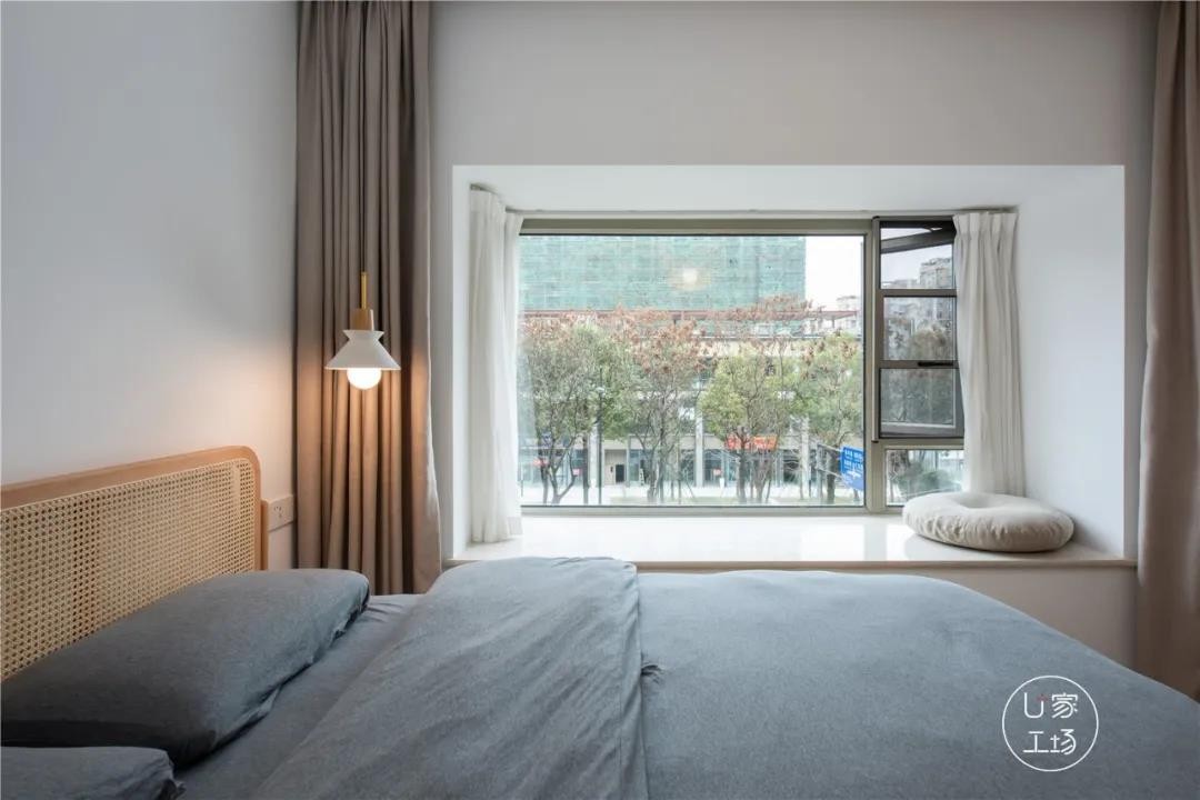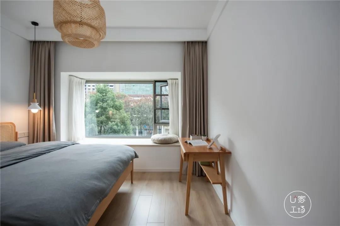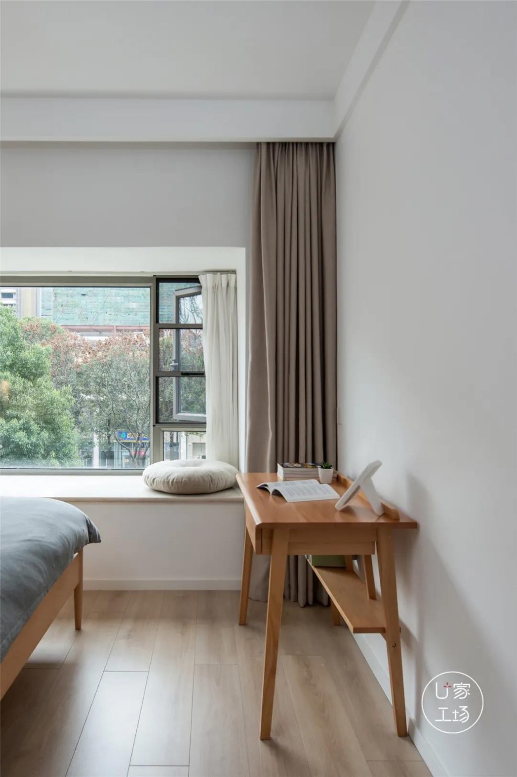 主卧内配有一个小型书桌,平日需要加班或看书均可在此,相当于在卧室里内置了一个迷你书房。 窗外风景不错,便保留了主卧的飘窗,摆放有蒲团,偶尔可坐在窗边喝茶观景。