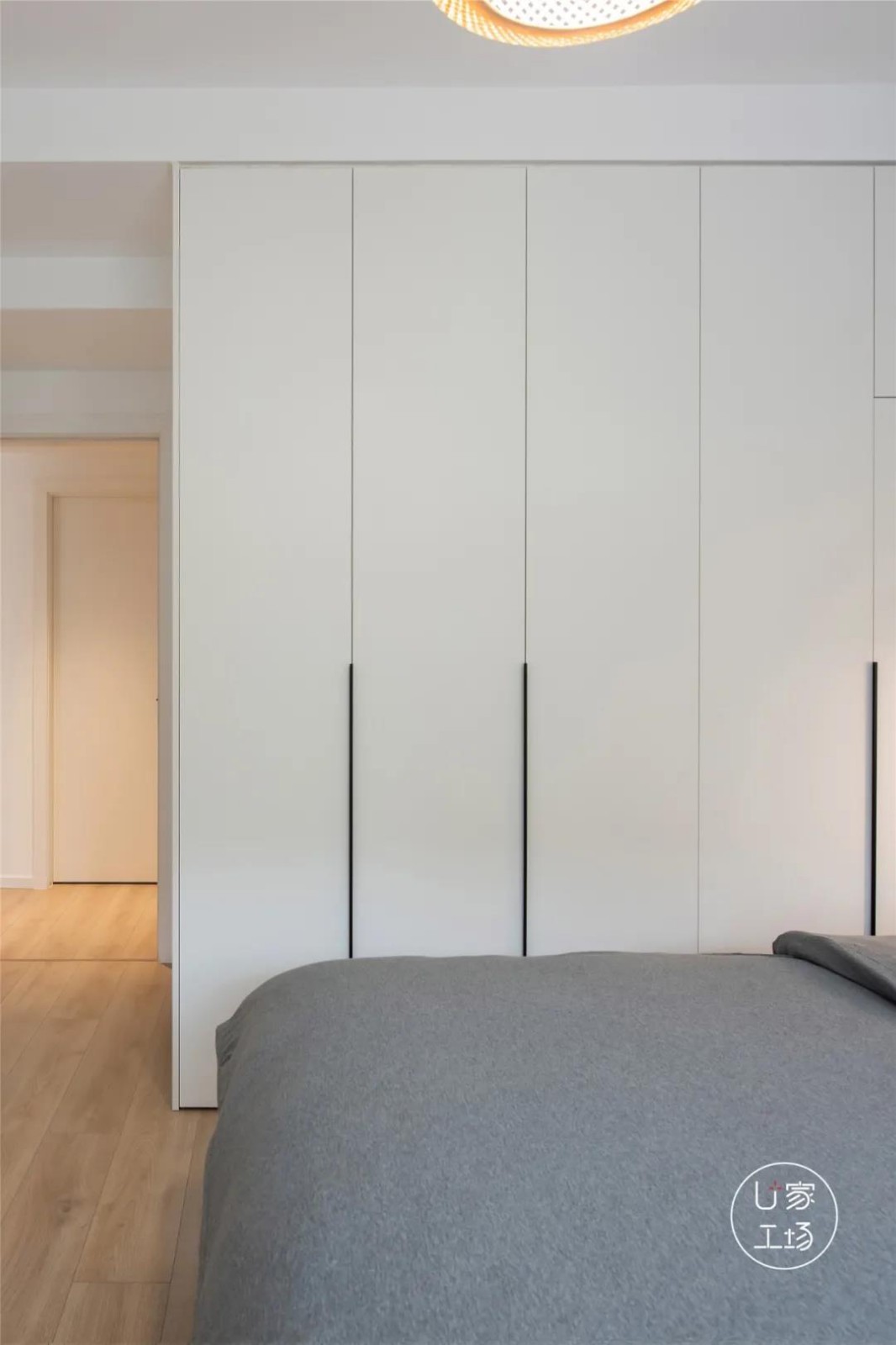 主卧的一整面墙壁定制了整体衣柜,一柜到顶充分利用空间,当季衣服、换季衣物、四季床品皆可收纳。白色柜门与墙壁同色,黑色门把手打造纵向拉伸的视感,从视觉上为空间扩容。
