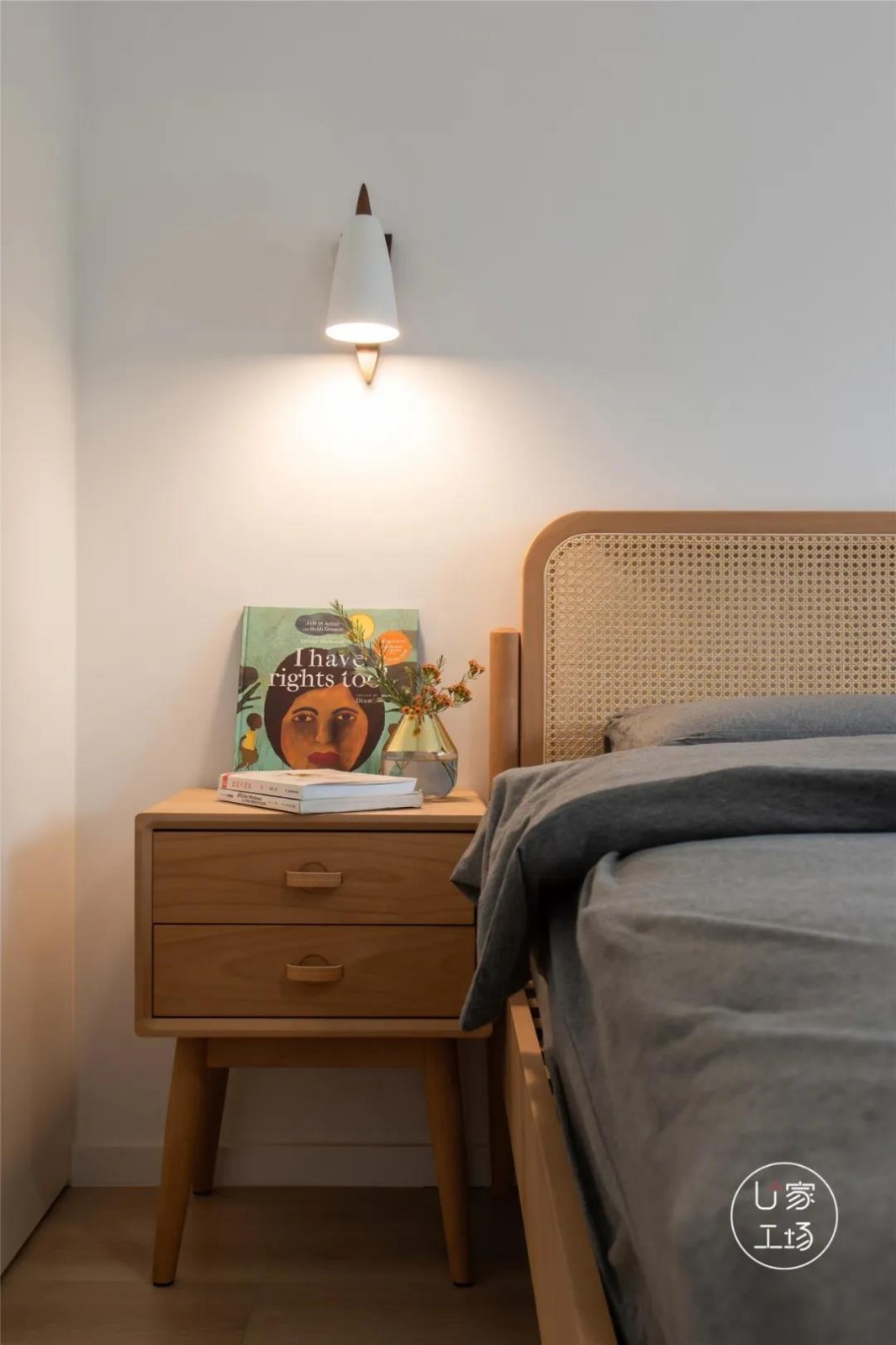 床头柜上方的壁灯则作为起夜灯,同样能够烘托静谧的氛围感。