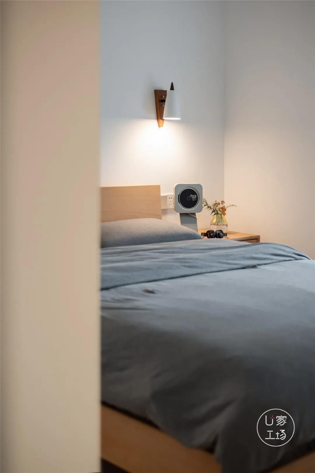 次卧和主卧风格保持统一,不设吊灯,仅保留床头一盏壁灯,方便夜间起夜。全屋家具尤为精简,不增加任何额外装饰,坚持空间留白。
