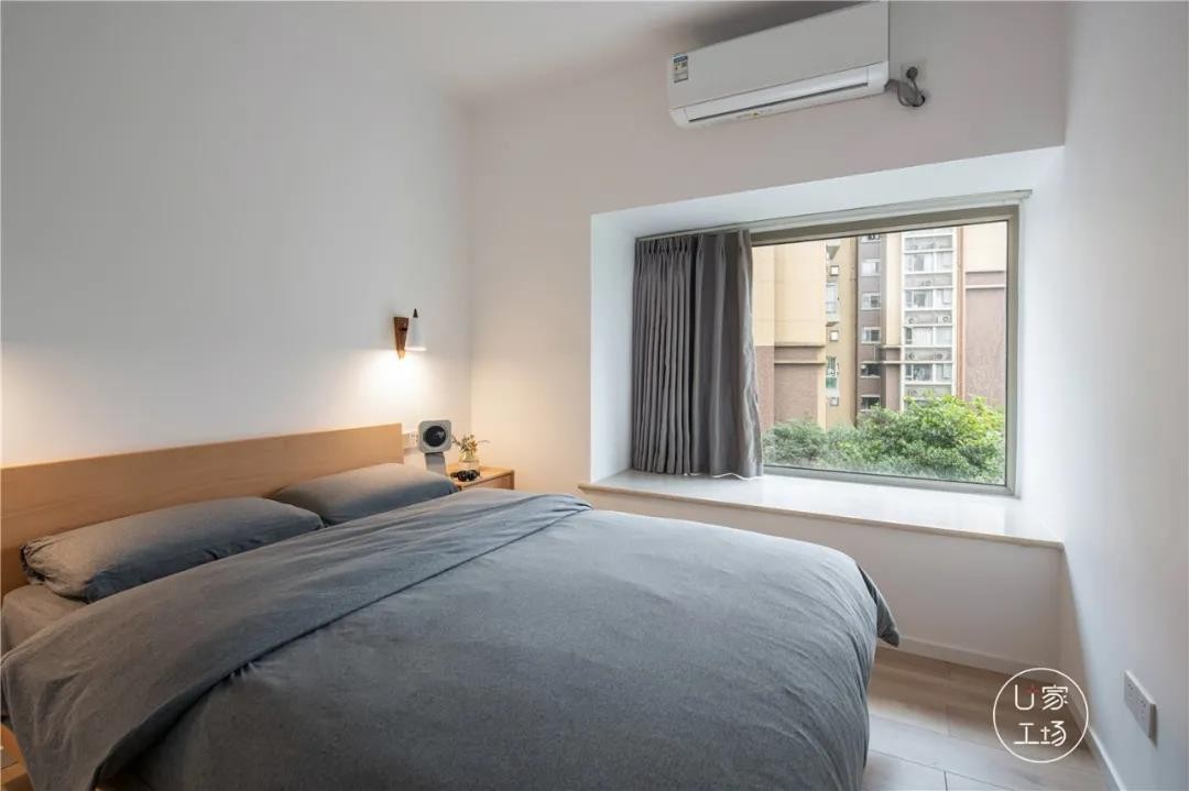 改造后的主卧沿袭了全屋的极简风格,白+原木+灰的基础配色,墙面留白,不增加任何装饰,颇有侘寂美学的韵味。