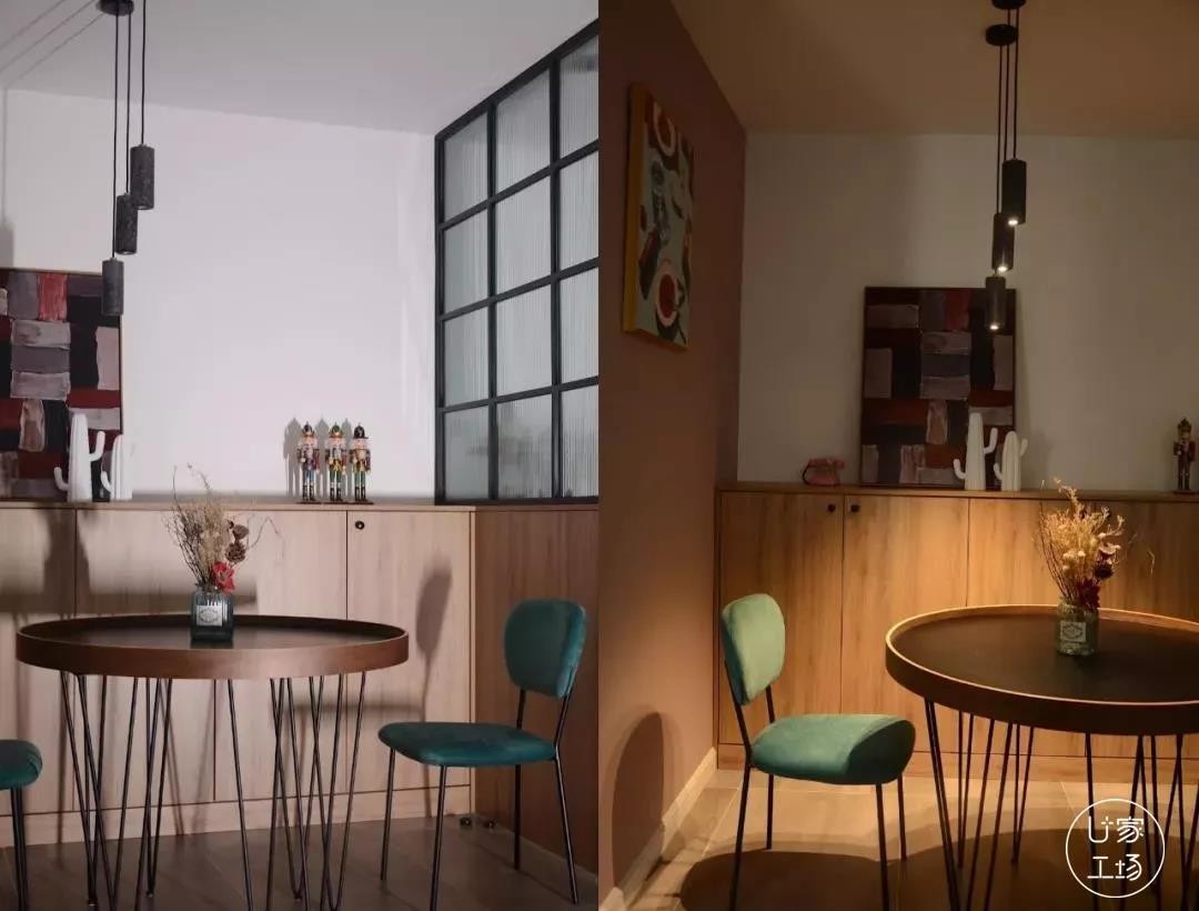 ▲餐厅区域 开灯or关灯对比,全屋光源的色温、瓦数、照度以及位置都是由设计师精心挑选搭配,一个人在家关上灯也能营造出浪漫的氛围。