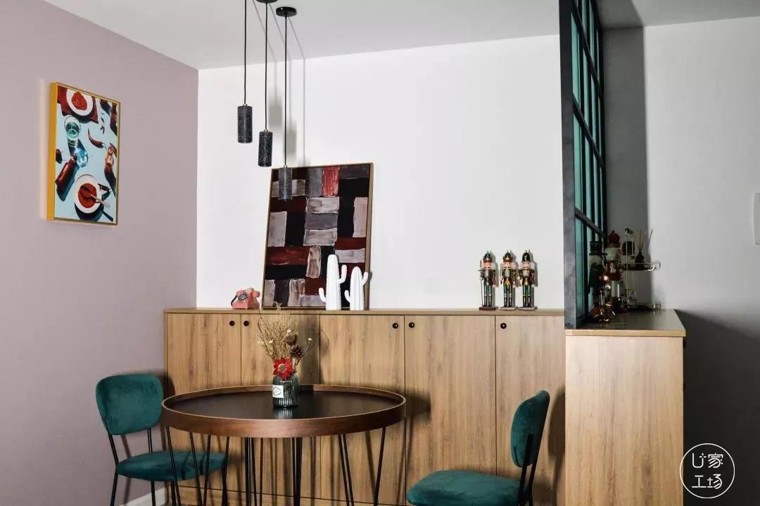 玄关的打造,让餐厅变成了围合式,更加精致温馨。圆桌让空间更加灵活,半高餐边柜置放了一些摆件和挂画,增添了趣味性。