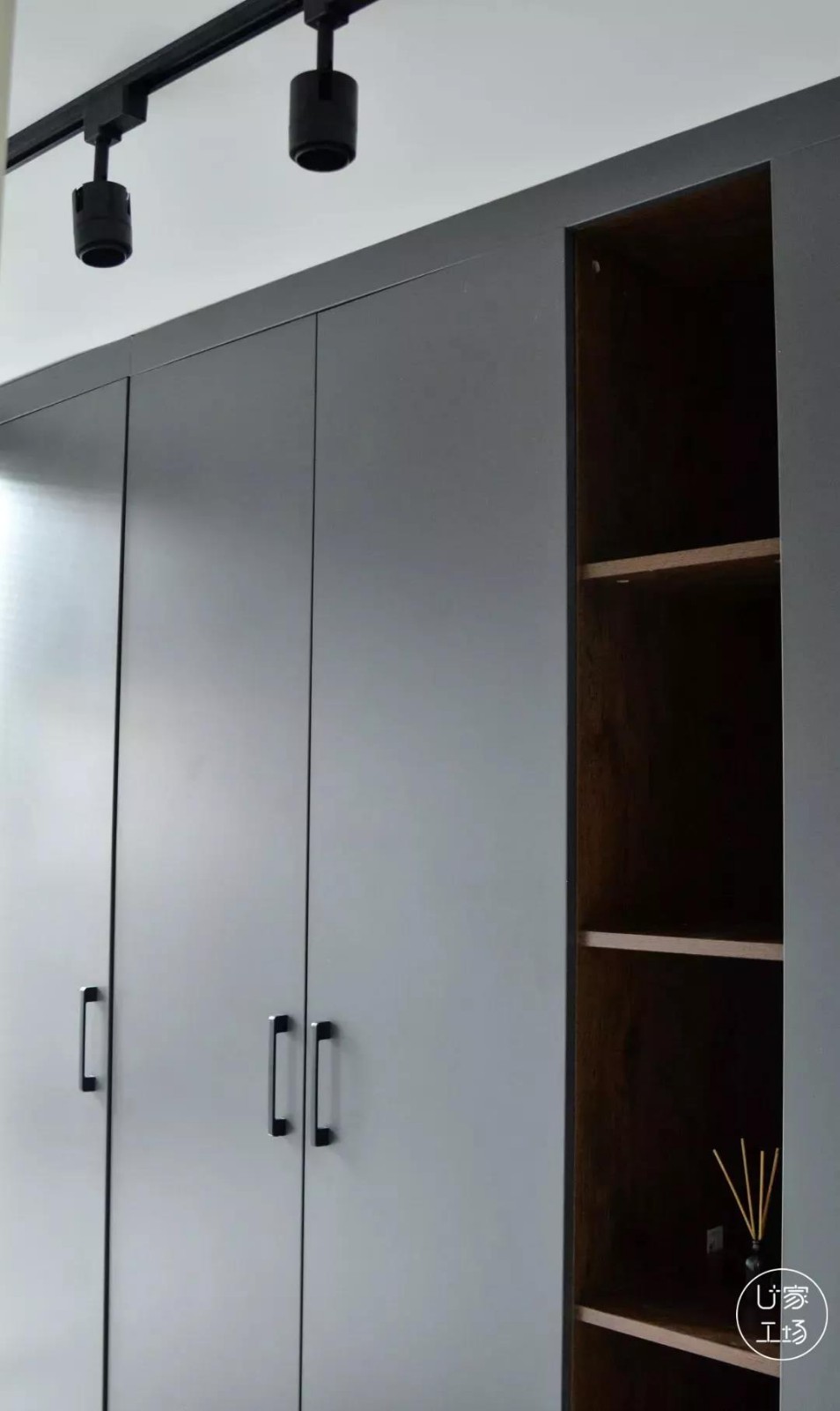 衣帽间是由原卫生间打造的,原木色搭配深灰色,干净精致。开放格方便放置包包等小物品,也非常具有设计感。