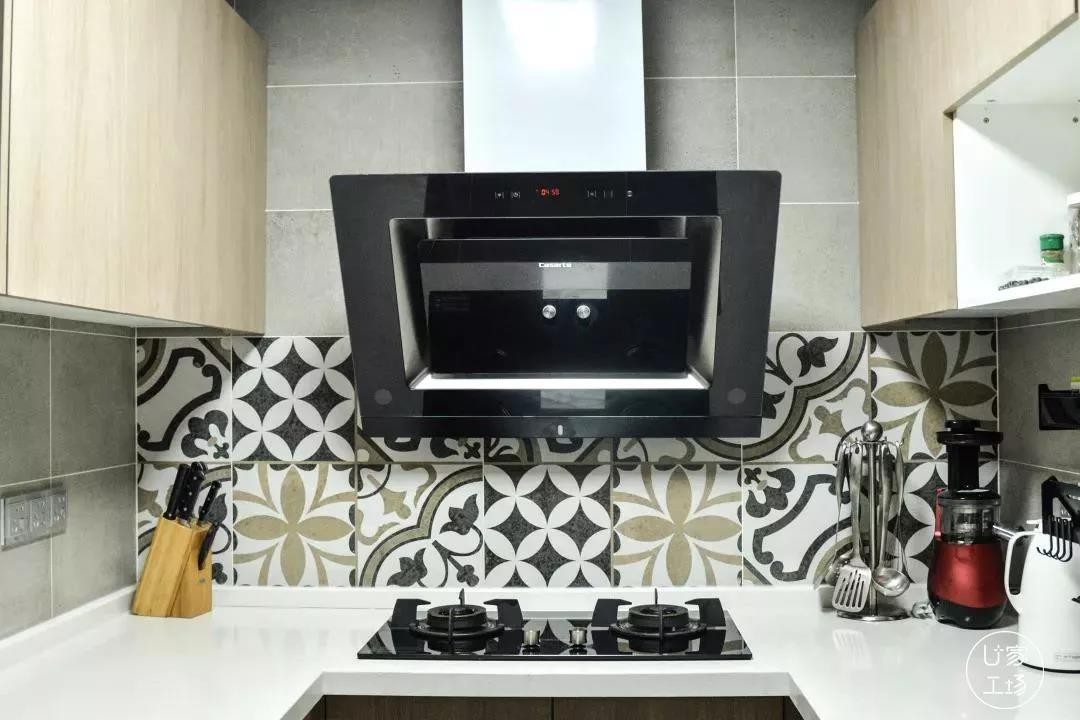 原始一字型厨房大量空间浪费在过道上,导致储物空间不足,动向也不明确。通过改造,打造了一个U字型厨房,分隔出一个生活阳台。