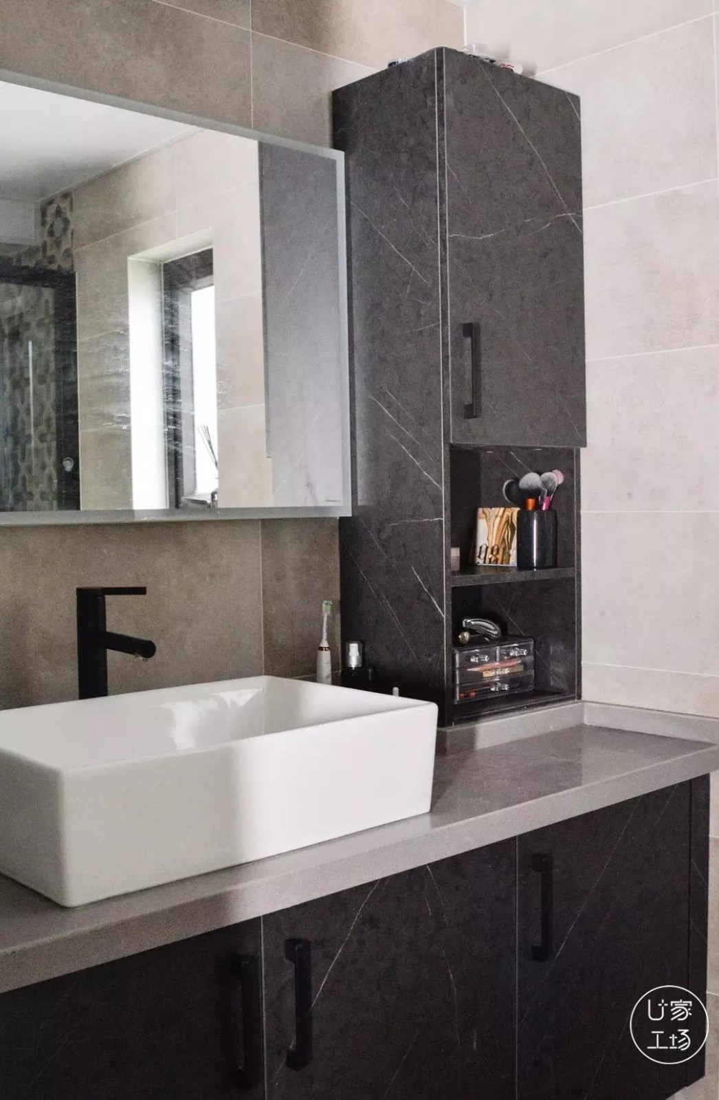 将原始的门洞区域往左稍移了一些,使洗面台和收纳柜的区域更加宽敞,方便业主的使用。