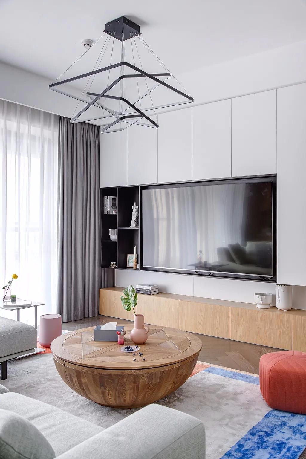 ▲底部木质电视柜,而上方则是采取黑白配,地毯是灰色主题加入蓝色与粉色的组合,搭配一个红色的鼓凳、茶几上粉色花瓶、灰色纸巾盒,也这个空间显得更加简约浪漫。