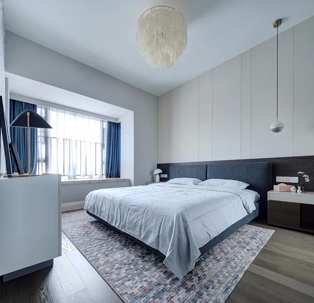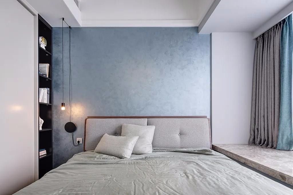 ▲卧室床头墙以深灰色墙脚+米白色的墙身硬包,搭配上蓝色的布艺床,还有浅蓝色的床单,地面地上马赛克图案的地毯,搭配上深蓝色的窗帘,整个空间显得简约舒适而安静。