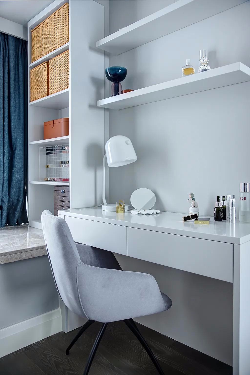▲卧室另一边有个飘窗,利用飘窗装一个书架+书桌+梳妆台一体的柜体,让空间利用更加透彻到位。