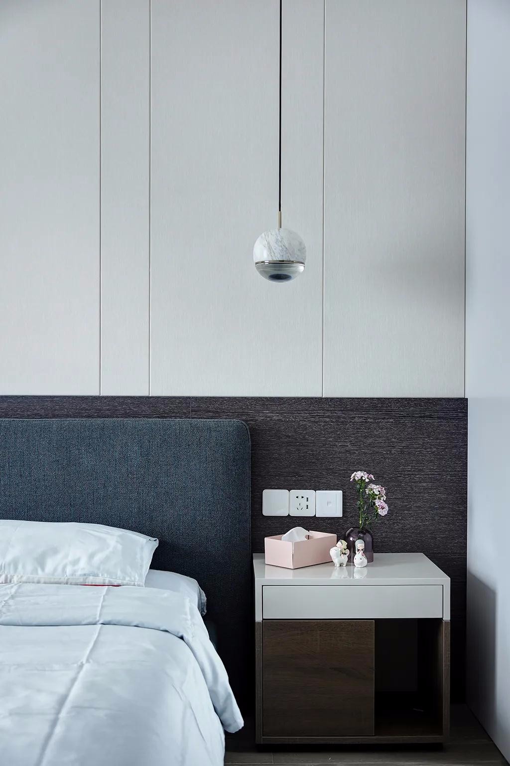 ▲次卧床头墙是灰蓝色的墙面,布置带灰色布艺靠背的实木床,床侧边的衣柜在最里侧加入一列黑色的空格充当床头柜与书架,摆上书籍摆饰品,显得更加实用端庄。