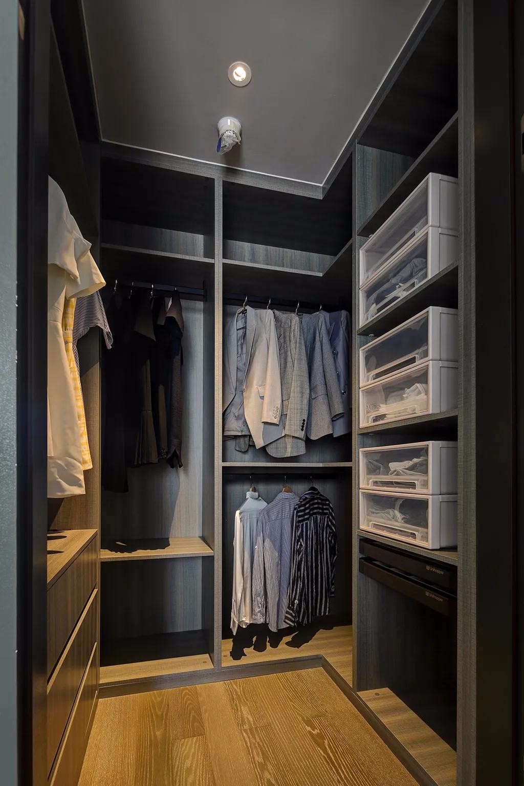 ▲衣帽间深木色的衣柜柜体,采取无柜门的衣柜,挂起来的衣服一目了然,找起来更加方便。