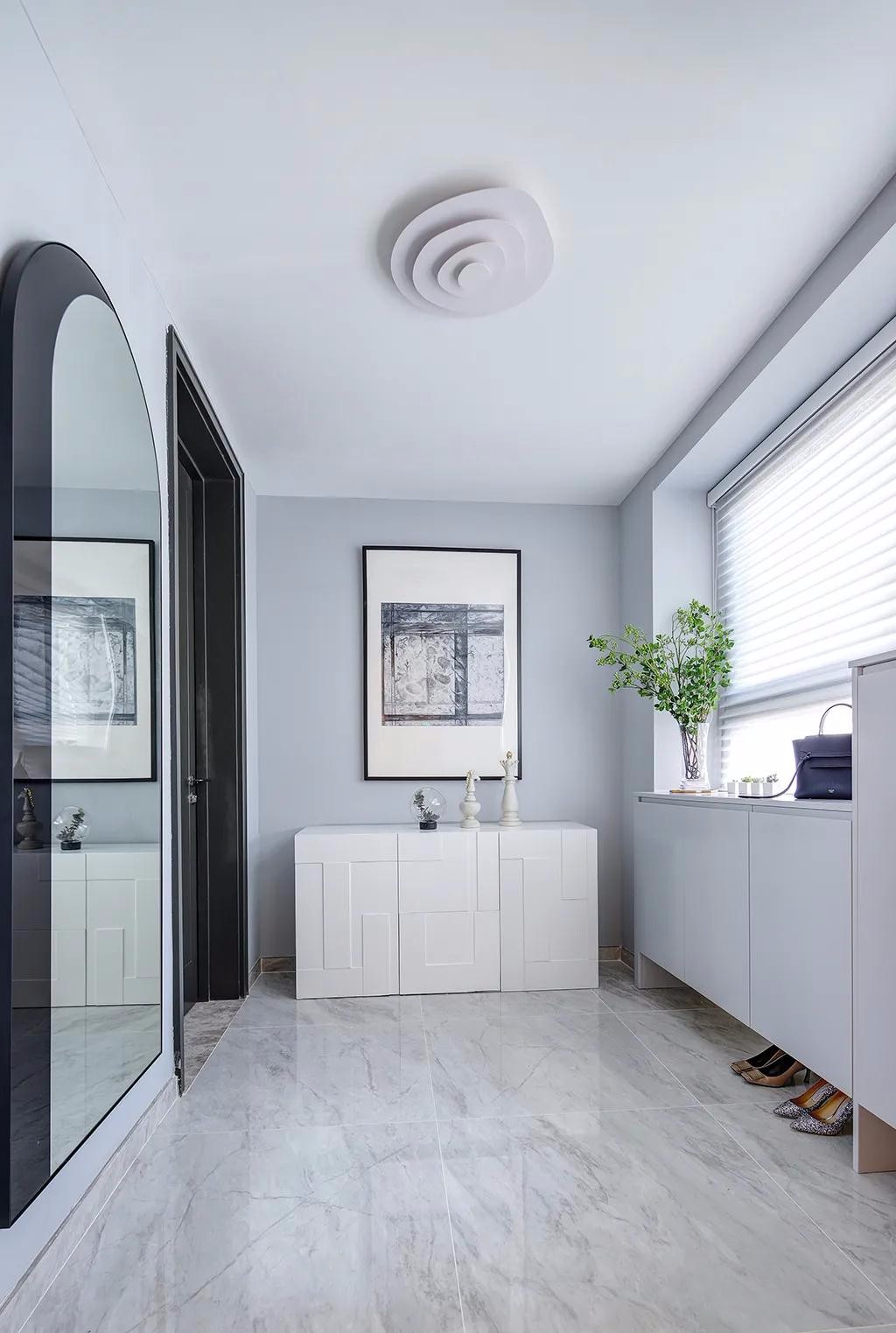 ▲玄关靠窗定制一排矮柜鞋柜,斜对天猫上布置花瓶与包包,实用而清新,而底部的留空则是方便临时换下鞋子的摆放,门后也是摆了一个矮柜作为端景台,结合正对鞋柜的一个全身镜,让回家的***个空间就充满实用与精致的体验。
