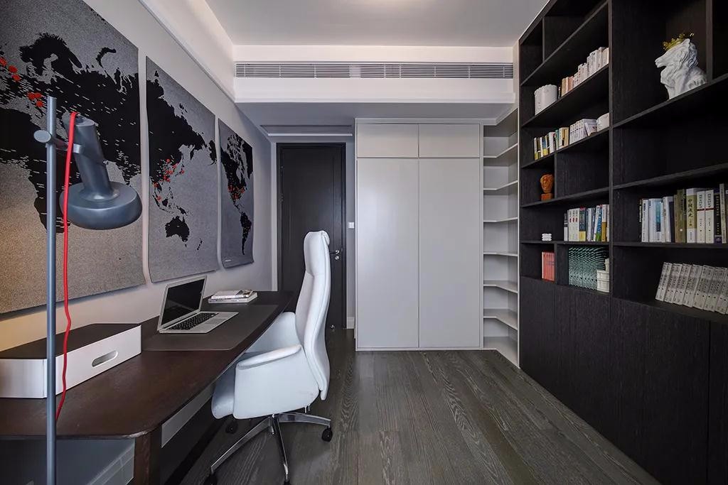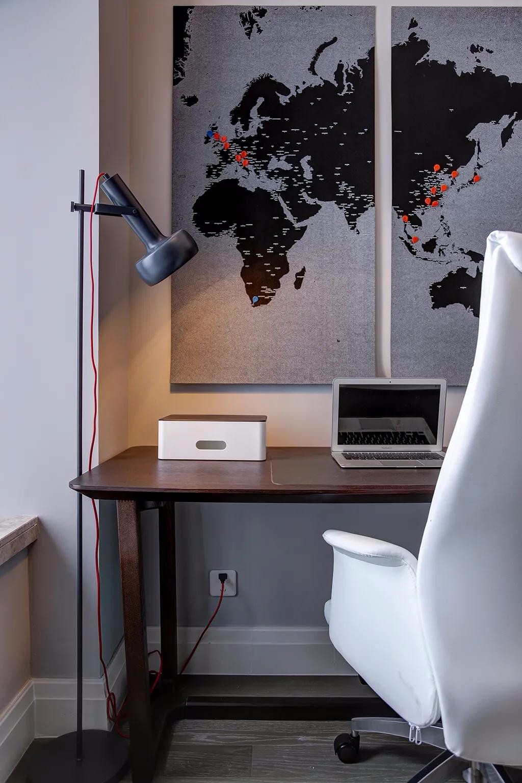 ▲成品书桌也可以挪动到靠墙位置,墙面一幅黑灰配的布艺材质的抽象地图挂饰,也让空间更加端庄***意韵。