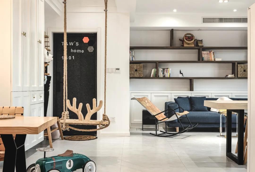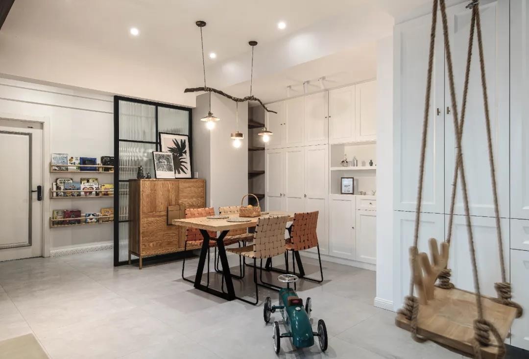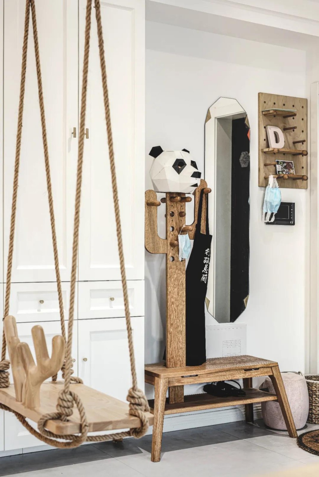 玄关处别出心裁的用秋千做隔断,秋千是爸爸送给女儿的礼物。仙人掌洞洞板换鞋凳,兼顾了置物的功能,颜值在线且实用性翻倍