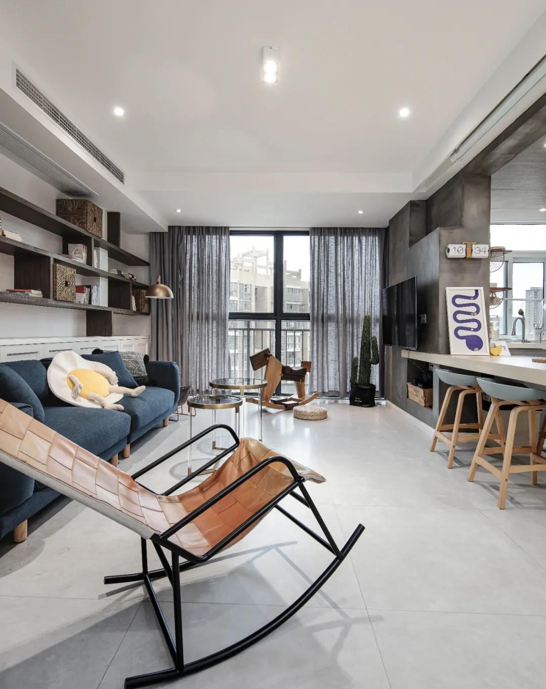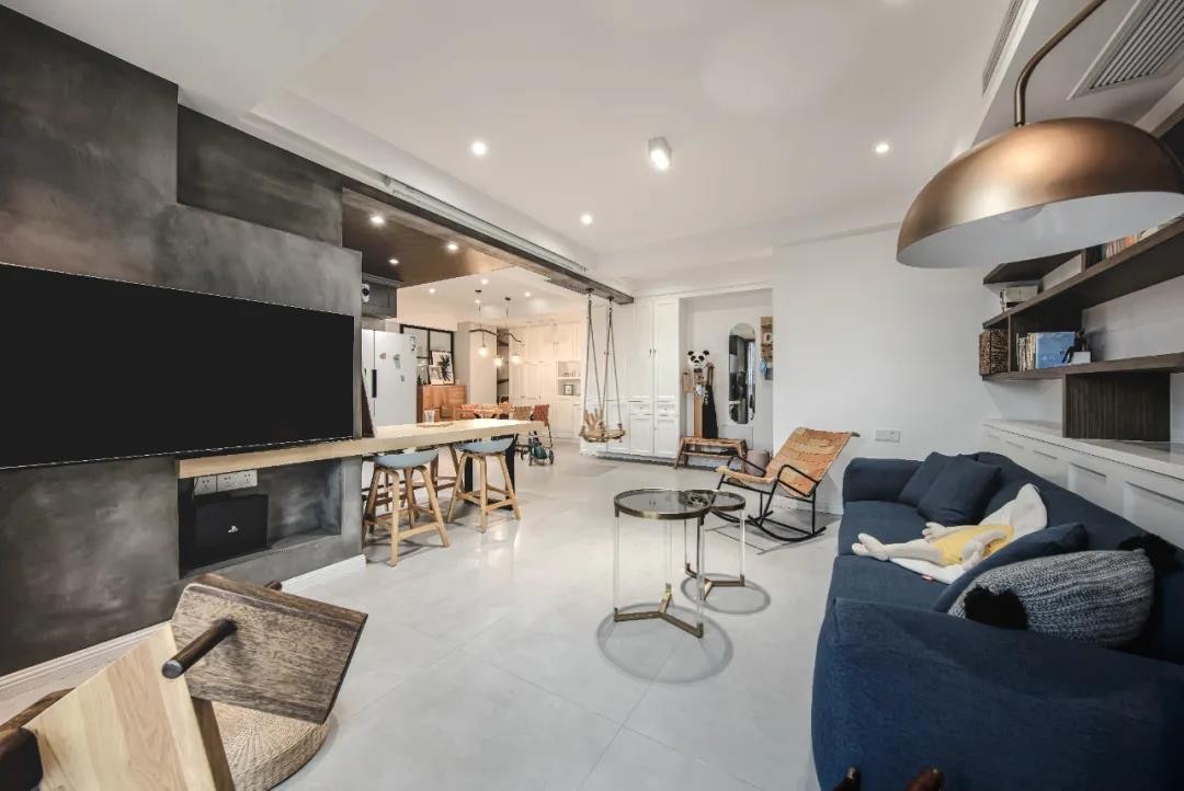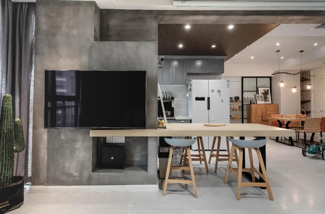 客厅没有传统的电视柜、电视背景墙,取而代之的是电视水泥墙和木质吧台相结合的功能空间。电视机下方还设计了壁龛,方便放置路由器等杂物。