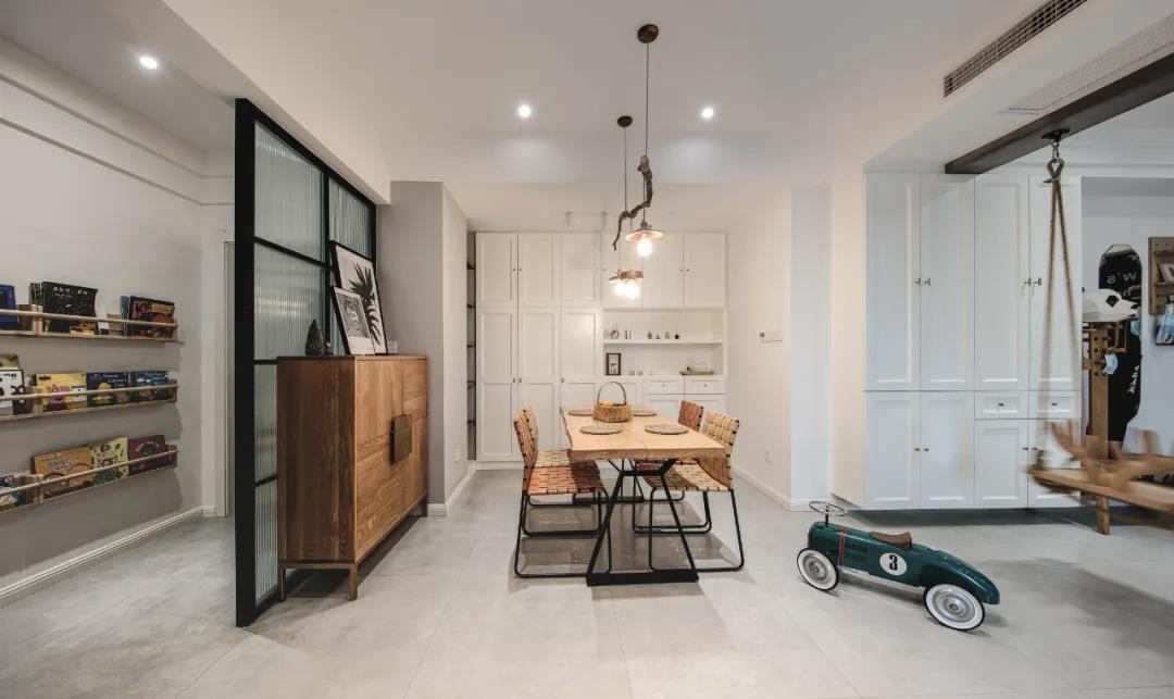 原户型本来有个独立的衣帽间,为了有充足的活动空间,女主人忍痛割舍了。 不过虽然没了衣帽间,二娃之家储物空间却一点没少。储物柜从门厅区域一直延伸到餐厅,满足了四口之家的日常囤货所需。
