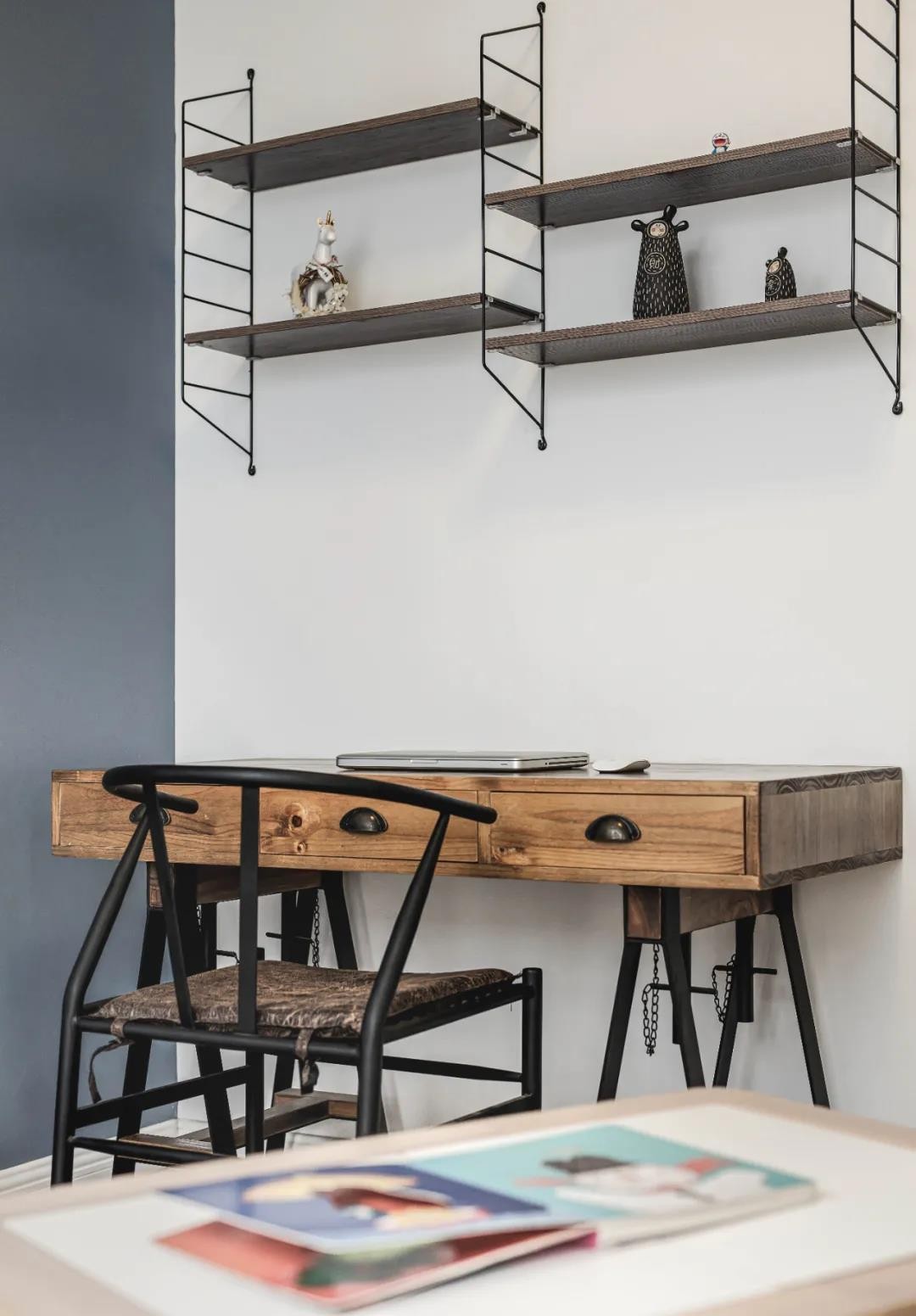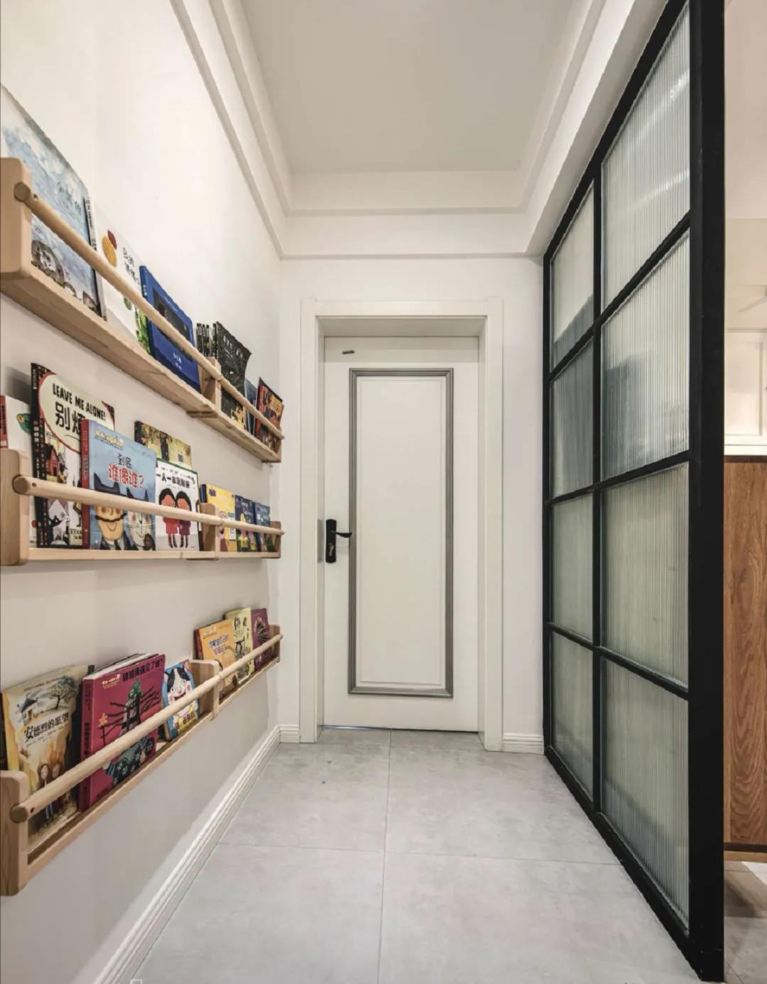 秉着充分榨干每1㎡的原则,设计师将卧室外的过道做了一组壁挂书架,专门用来放小朋友们的绘本,走到哪停到哪,累了就可以拿起绘本席地而坐。
