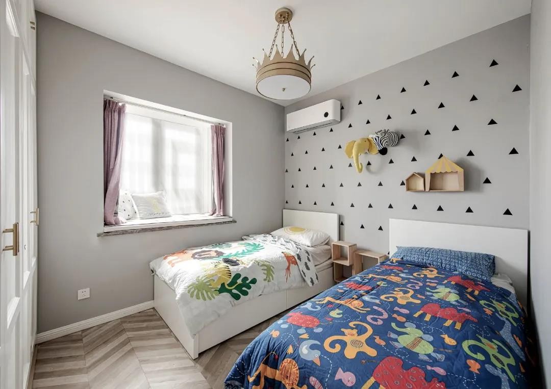 由于在装修期间,迎来了家里的新成员,姐姐有了个可爱的弟弟,所以临时将儿童房做成了双人的,在他们年纪都还小的时候,完全可以同住一个房间互相陪伴。