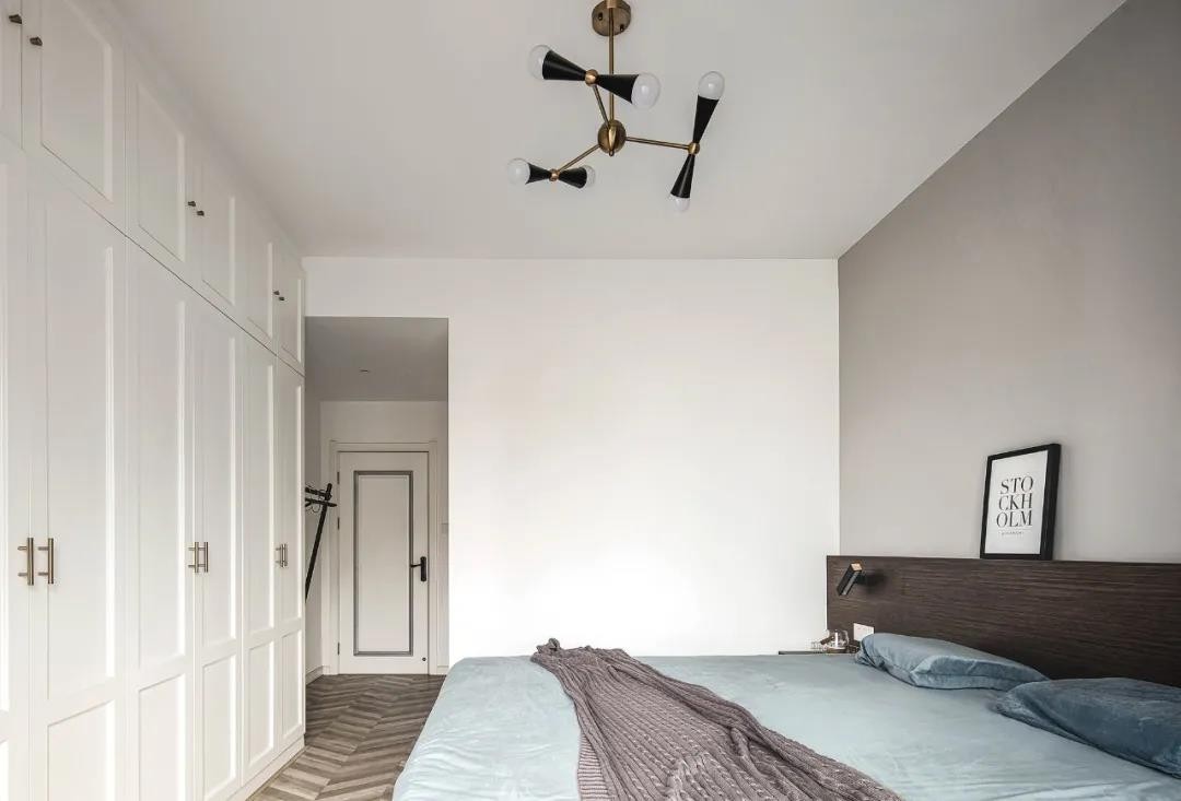 床尾一整排顶天立地的储物柜,完全可以满足夫妻二人的衣物收纳。