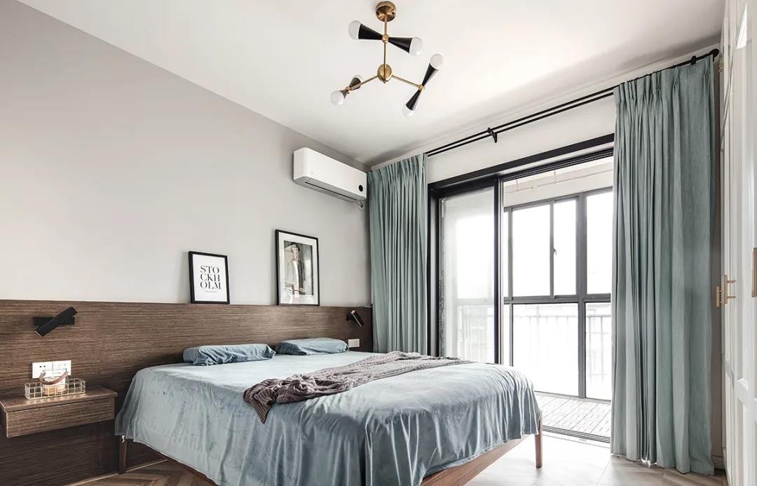 主卧的设计以简单舒适为主,床头采用了深褐色的木饰面提升了空间质感,床头的小壁灯可以调节角度,适合睡前阅读,也不占用床头柜空间。 搭配低饱和度蓝绿色系的床品和窗帘,营造出清新柔和、静谧放松的睡眠环境。